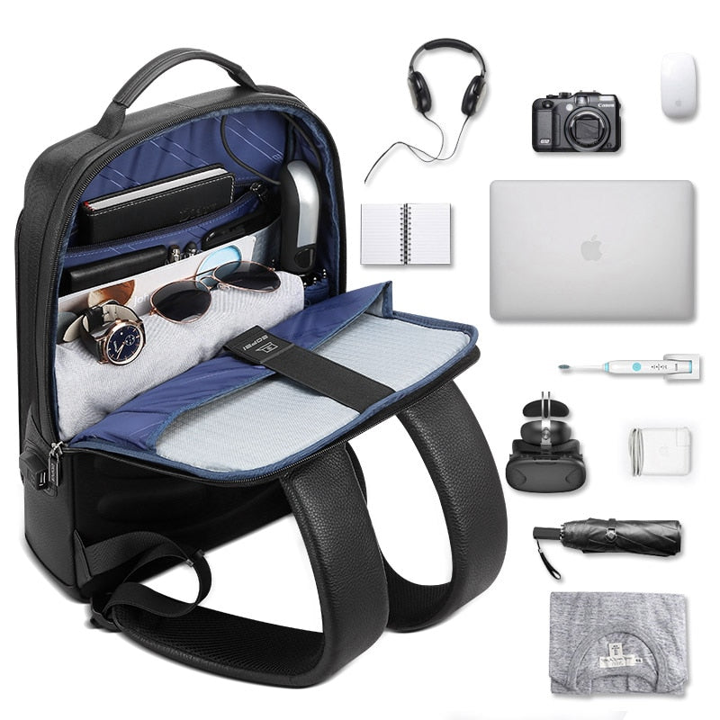Men’s Genuine Leather Travel Thin USB Charging Laptop Backpack