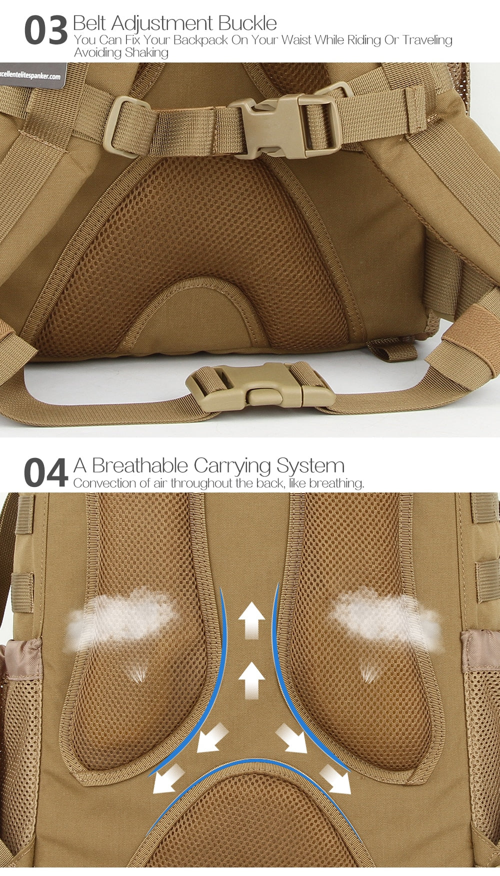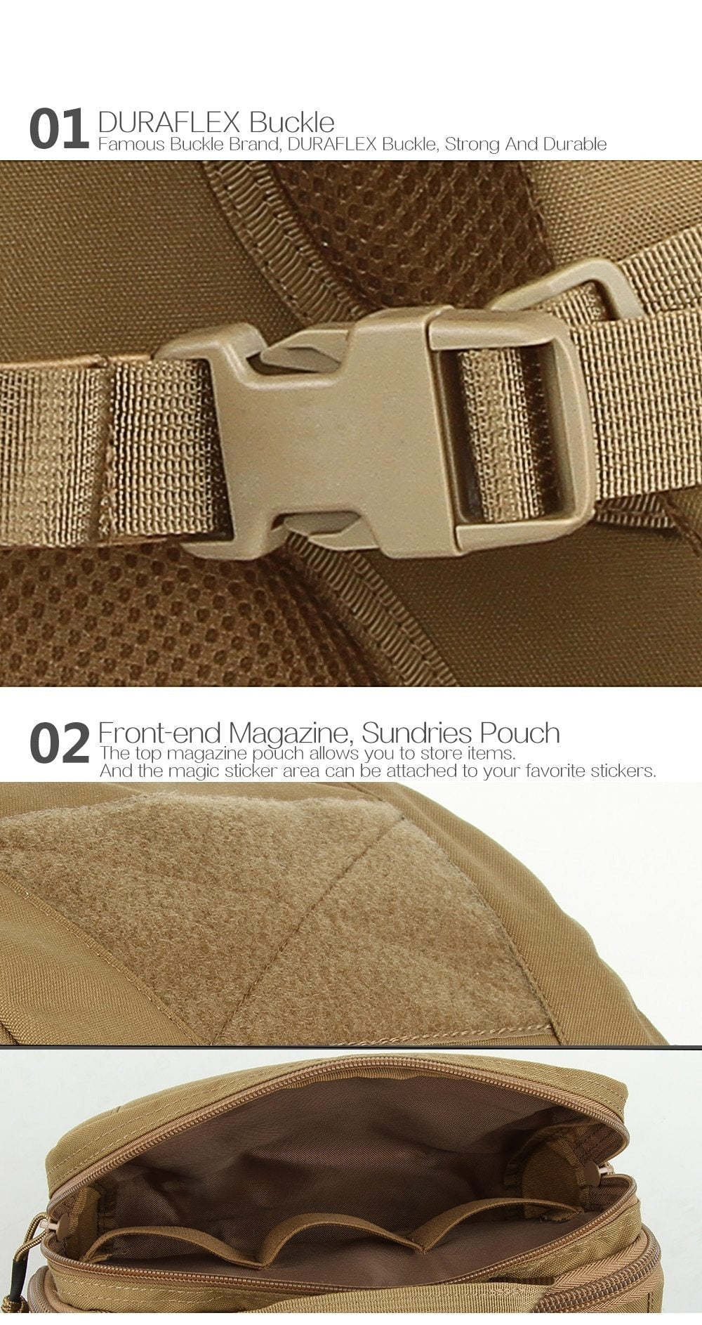 Available in Army Green, Khaki, Tactical Black, and Tactical Grey, these neutral tones are perfect for various tactical, military, or outdoor environments. The backpack features a modular MOLLE system with webbing straps across the front and back, allowing you to attach pouches, patches, or accessories according to your needs. It also has multiple organizational zones, including a main compartment, front organizer pocket, side mesh pockets, and internal magazine holders.