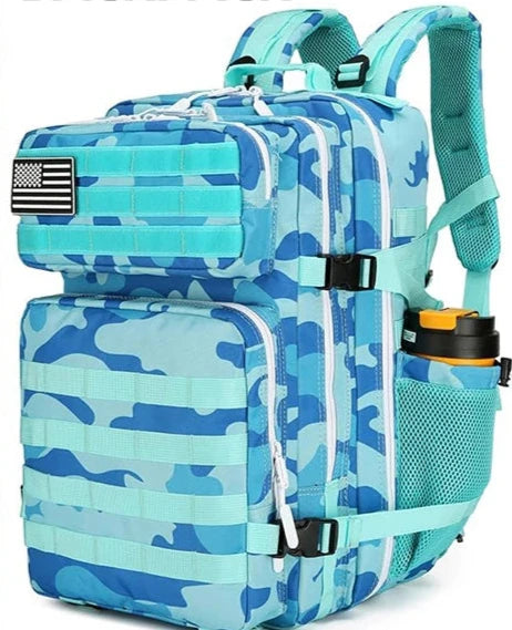 This 45L 3P Military Molle “Green Blue Camouflage” Tactical Backpack is a perfect blend of style and functionality, suitable for various activities such as daily commutes, school, hiking, camping, and tactical or recreational use. The backpack features a unique pastel camo pattern in shades of blue and turquoise (mint green), with white zippers, a small black – and – white American flag patch on the top compartment, and orange/yellow accents on the water bottle holder, offering a modern and casual appeal while maintaining its military – inspired look.