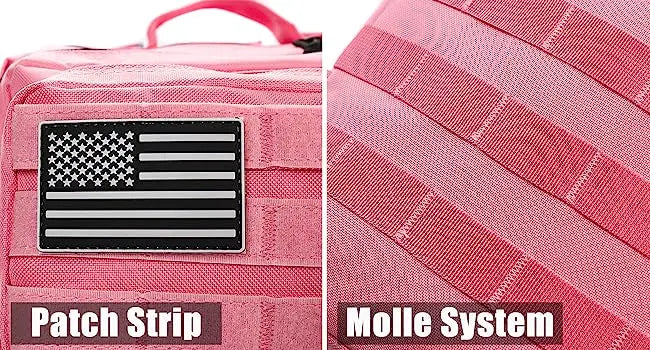 The bright pink color of the backpack is solid and eye – catching, with black accents on zippers, buckles, and straps for a tactical aesthetic. It features a Velcro – backed American flag – style patch that is replaceable and modular, adding a personal touch. The MOLLE system with horizontal and vertical webbing strips allows you to attach various pouches, tools, or accessories according to your needs.