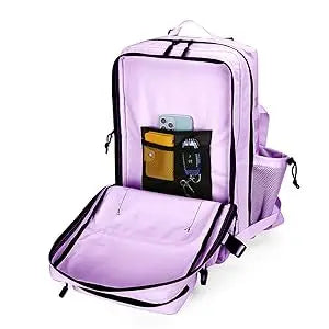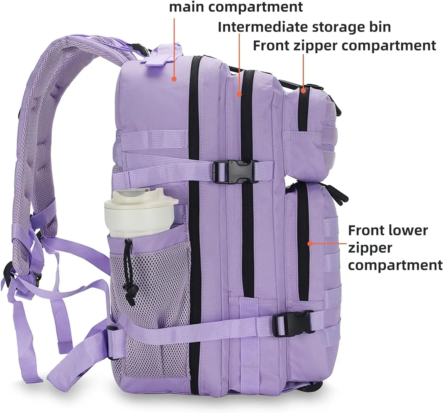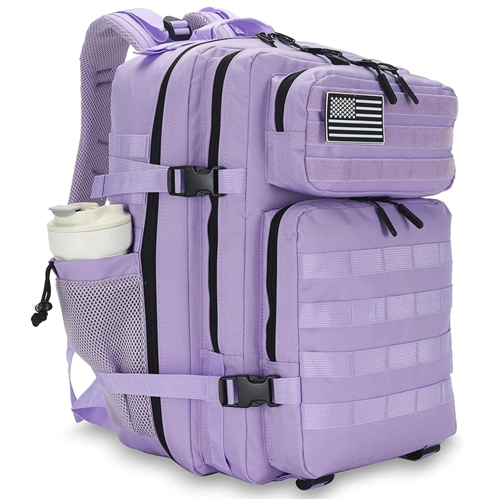 The primary color of this backpack is a beautiful light purple (lavender), with black zippers, buckles, and stitching providing a striking contrast. There’s a stylized “American flag” patch on the front pocket that is removable, probably Velcro – backed, adding a unique touch to the design. The MOLLE webbing on the exterior allows you to attach various pouches and accessories, such as first – aid kits or tools, according to your needs.
