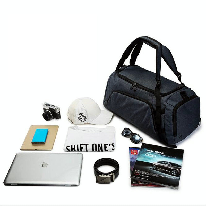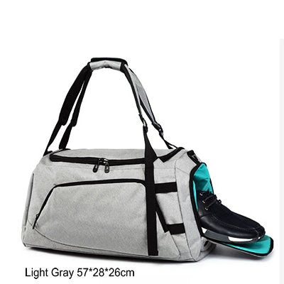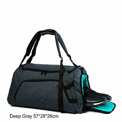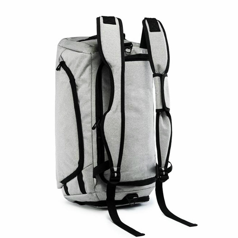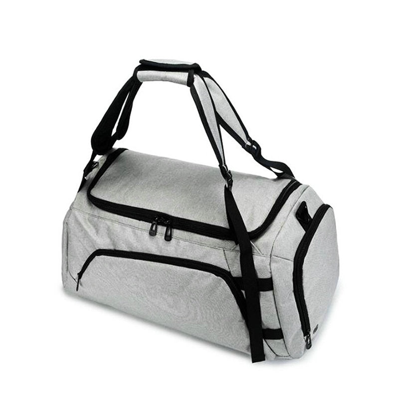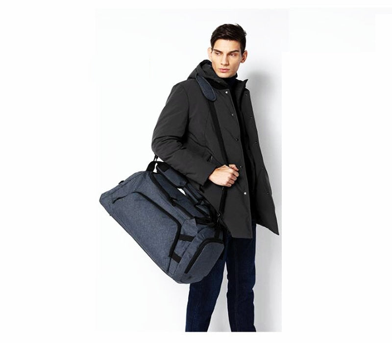 The bag is available in two primary color options: Deep Gray and Light Gray, both with black accents such as zippers, trim, and straps. Its minimalist and functional design features structured compartments including a front pocket, a main compartment, and a dedicated shoe compartment. The front pocket provides quick access to small items, while the multiple compartments help in organizing your belongings like laptop, shoes, clothes, and accessories.