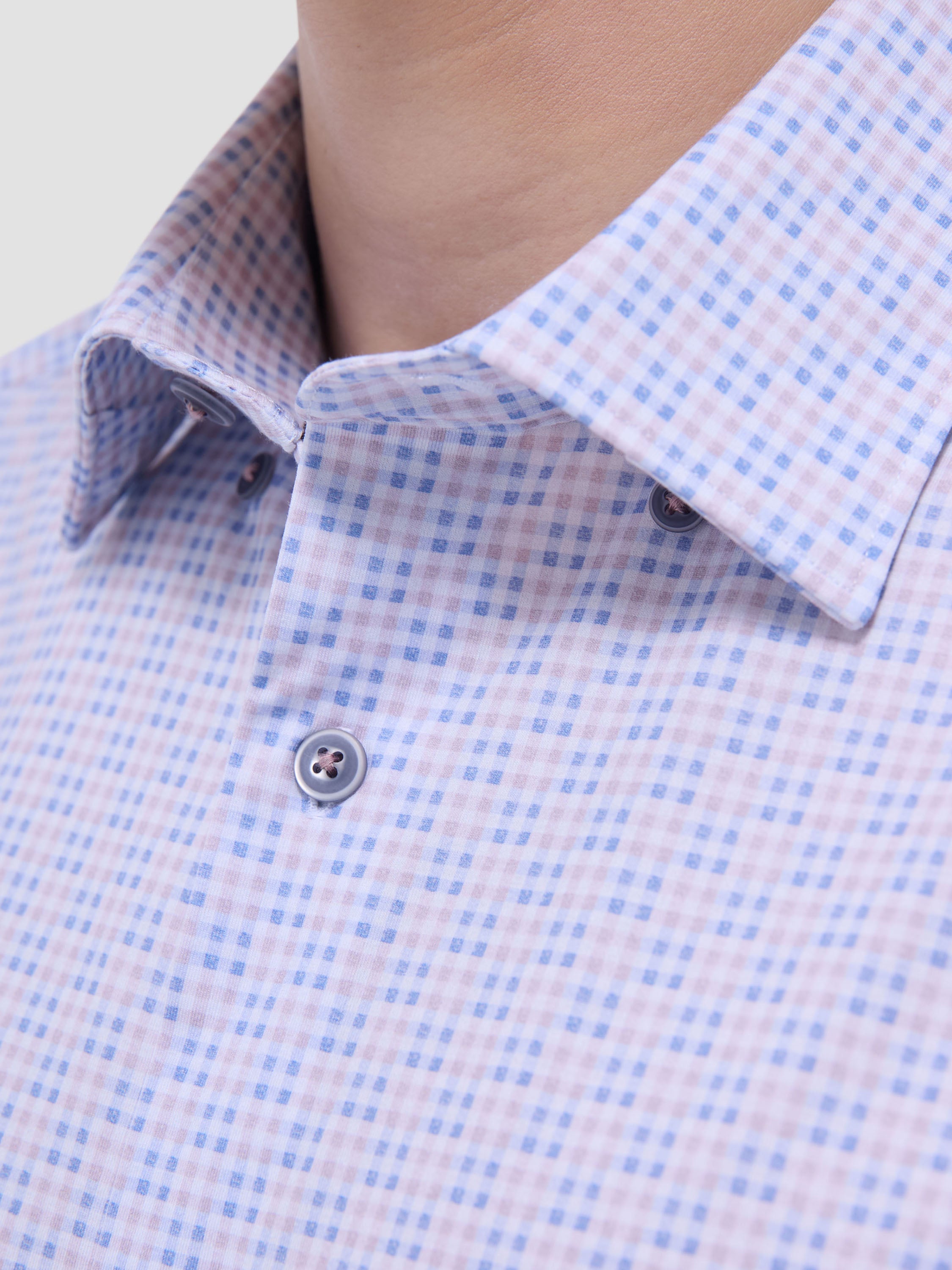 - Pattern: Subtle micro – check (tiny blue squares/dots)