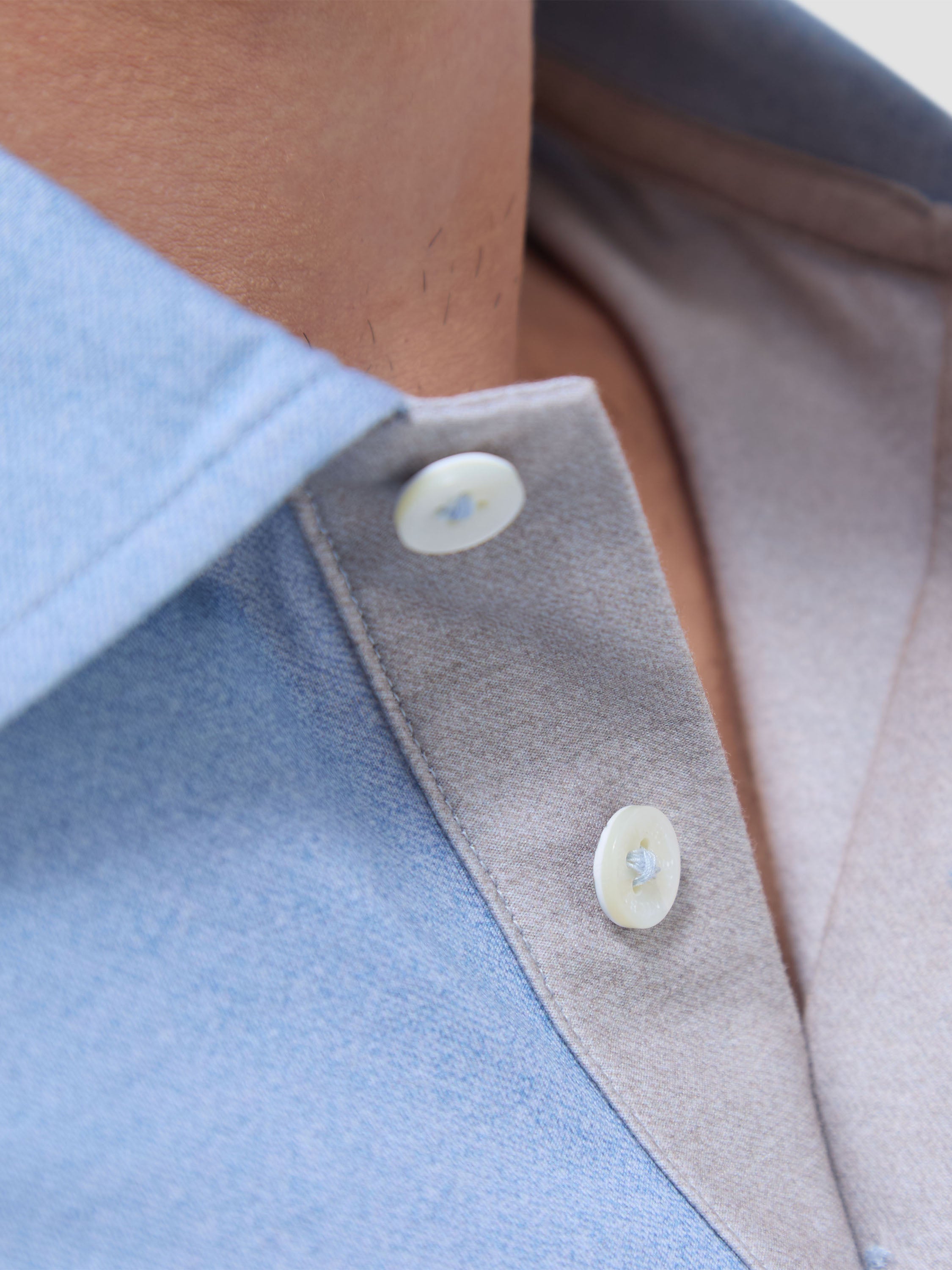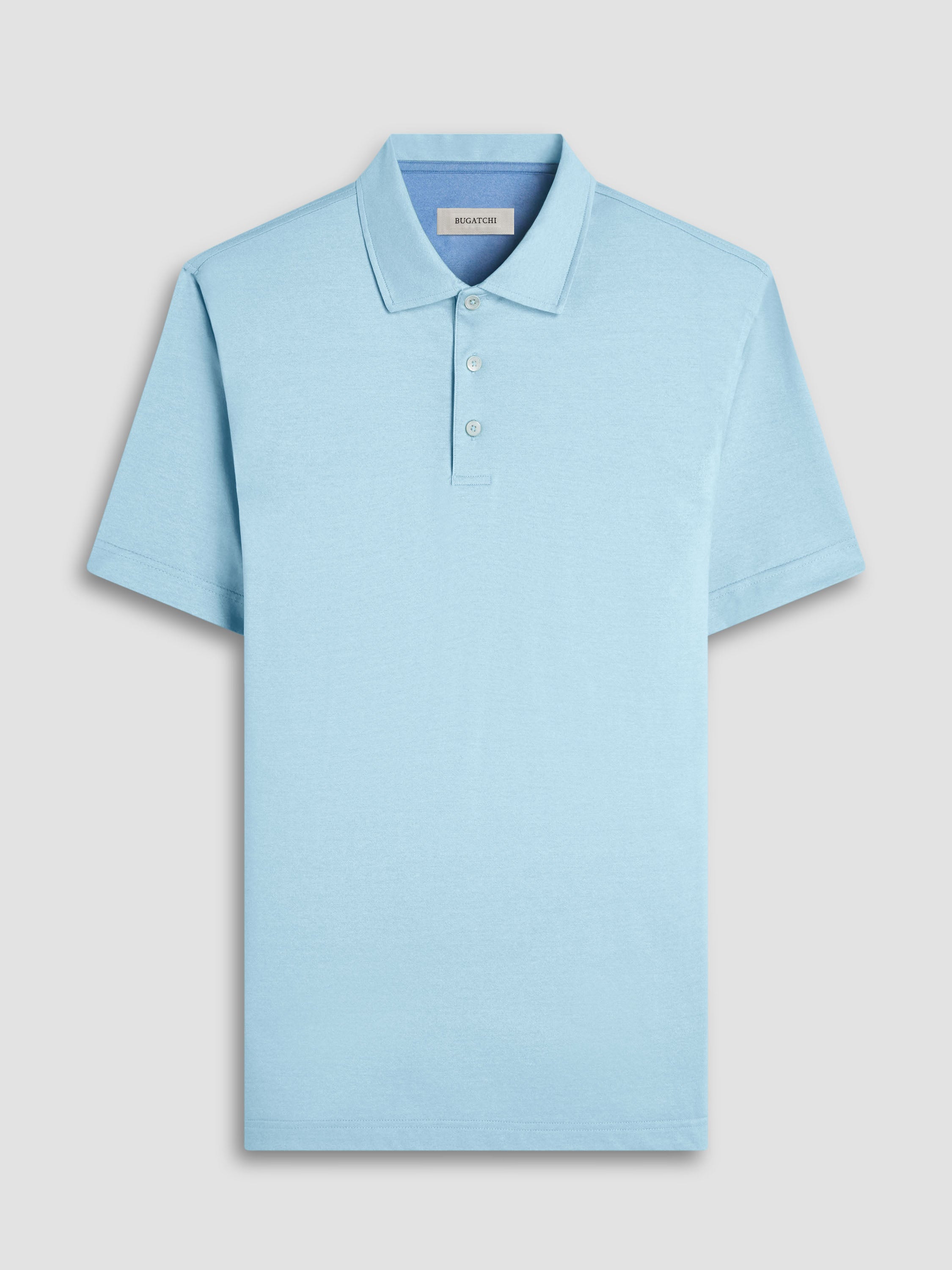 - Design: Three-button placket, structured folded collar, short sleeves with narrow cuffs, minimal chest pocket flap, tailored fit
