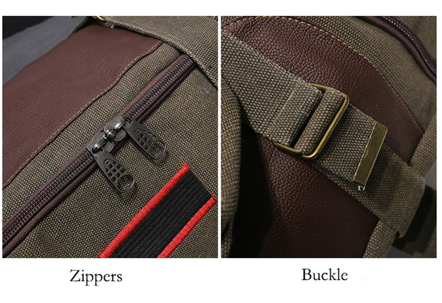 The main body of the bag is crafted from thick, durable canvas fabric with a textured weave, ensuring it can withstand wear and tear. Faux leather or leather – like brown patches near the zipper area add a premium touch. The reinforced fabric straps (likely canvas or nylon) with sturdy stitching and metal – toned hardware, including zipper pulls and buckles, enhance the bag’s overall quality.