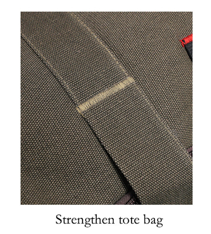 Features of the bag include dual top handles for hand – carrying and an adjustable shoulder strap with a black buckle for over – the – shoulder or crossbody use. The main zippered compartment is large enough for clothes and essentials, and there are potential side pockets implied by the structured design. Stitched seams labeled “Strengthen tote bag” ensure durability under load.