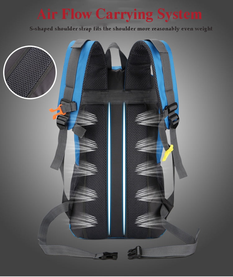 The ergonomic design of this backpack includes S – shaped shoulder straps that distribute weight evenly, reducing shoulder strain. A sternum strap prevents the pack from shifting during movement, and there are trekking pole holders on the sides to secure poles when not in use. Additionally, there is a top carry handle for portable use when the backpack is not on your back.