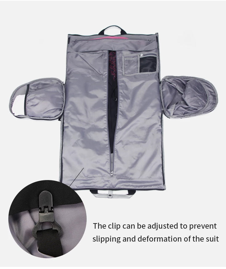 The bag is loaded with useful features. It has modular compartments, including a dedicated suit bag with clips to prevent suits from slipping or deforming, independent shoe compartments with breathable mesh, and interior zipped compartments for portfolios, laptops, or small items. The buckle system allows it to be attached to larger luggage handles, and the detachable shoulder strap provides hands – free carrying. The exterior fabric is waterproof, and the shoe compartments are breathable, ensuring your items stay dry and fresh.
