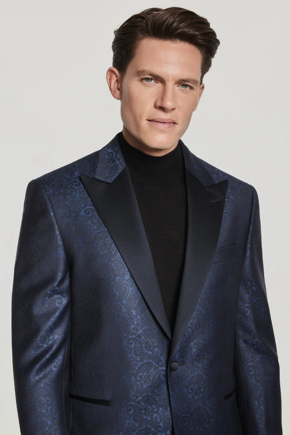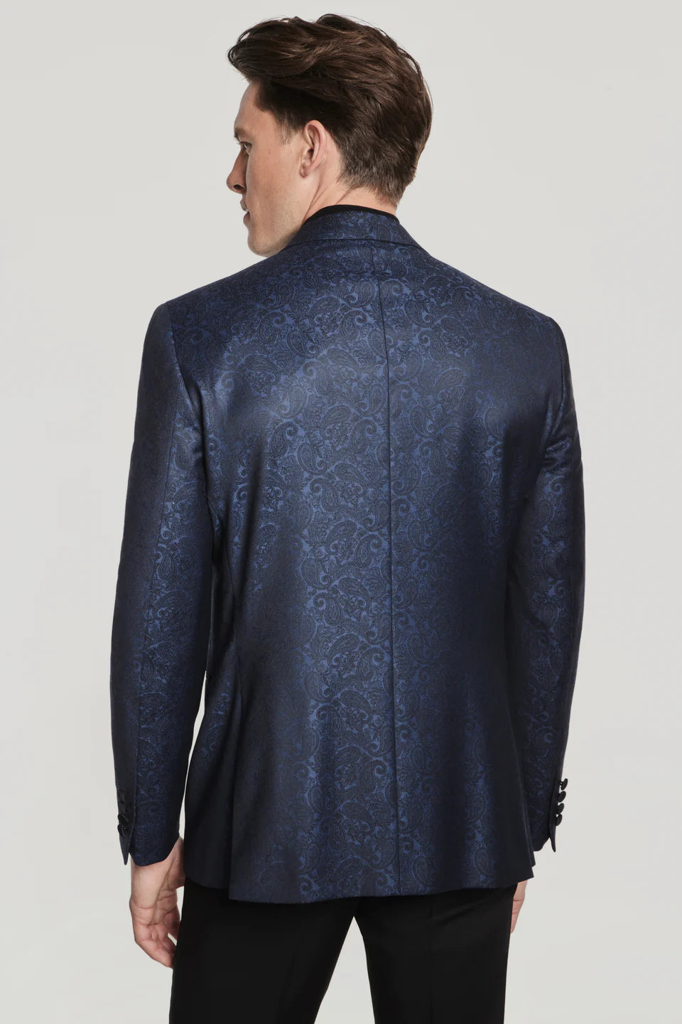| Jacket Color | Deep navy blue base with lighter blue/silver paisley/jacquard pattern |