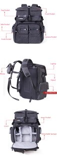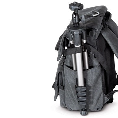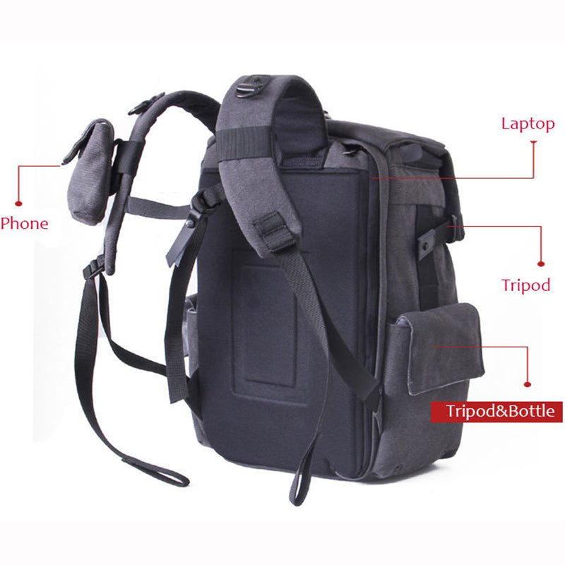 The exterior of the backpack is crafted from a durable, heavy – duty fabric, likely a canvas/polyester blend in a stylish dark gray/charcoal color. This fabric not only provides ruggedness but also offers water and abrasion resistance, ensuring your gear stays protected in various conditions. The interior is equipped with padded, detachable sponge dividers that can be customized to secure your cameras, lenses, and other fragile gear. Mesh pockets inside offer ventilation to keep your equipment fresh.