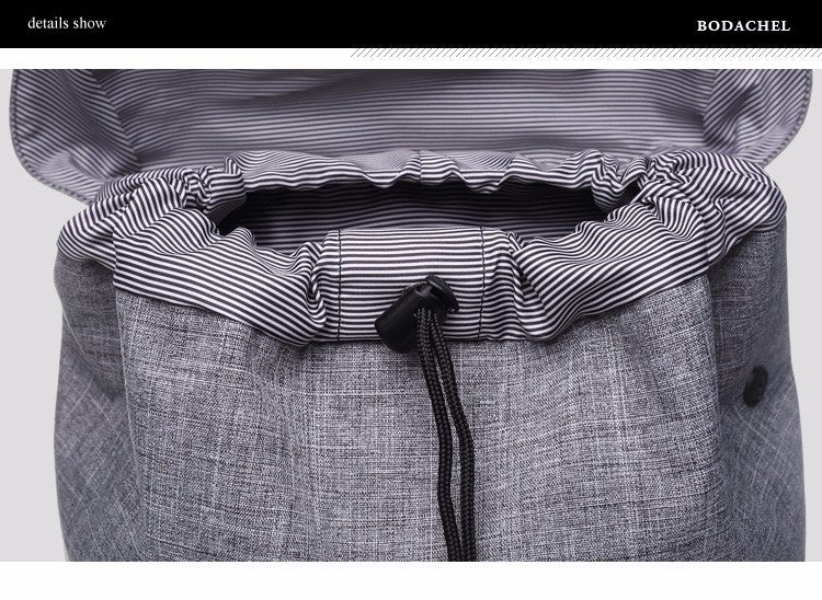 The backpack has a unique design with a curved, cinched flap top fastened by two vertical straps and black plastic buckles, providing a secure seal for the main compartment. There’s also a front pocket with its own straps/buckles and the Bodachel brand label on the front. Some variants have reflective details for better visibility in low – light conditions, and it has a minimalist aesthetic with clean lines and subtle branding.