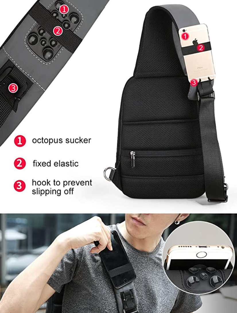 For security, it has a combination lock on the main compartment, and the adjustable shoulder strap can be adjusted left or right and has a locking hook to prevent slipping. The “octopus sucker” phone holder on the strap uses suction cups and elastic bands to securely hold your phone for quick access, and the shoulder strap also has a card pocket for easy access to cards.