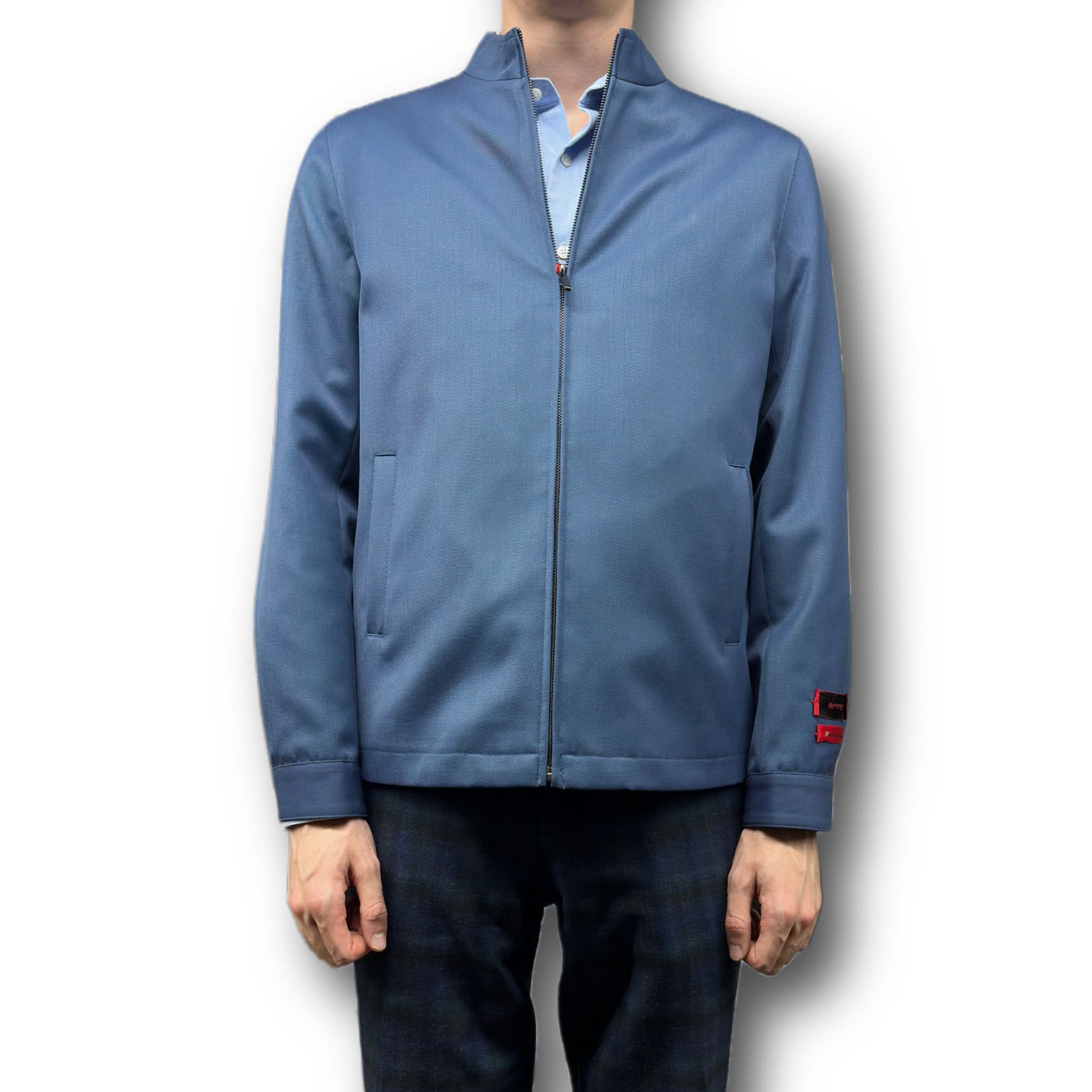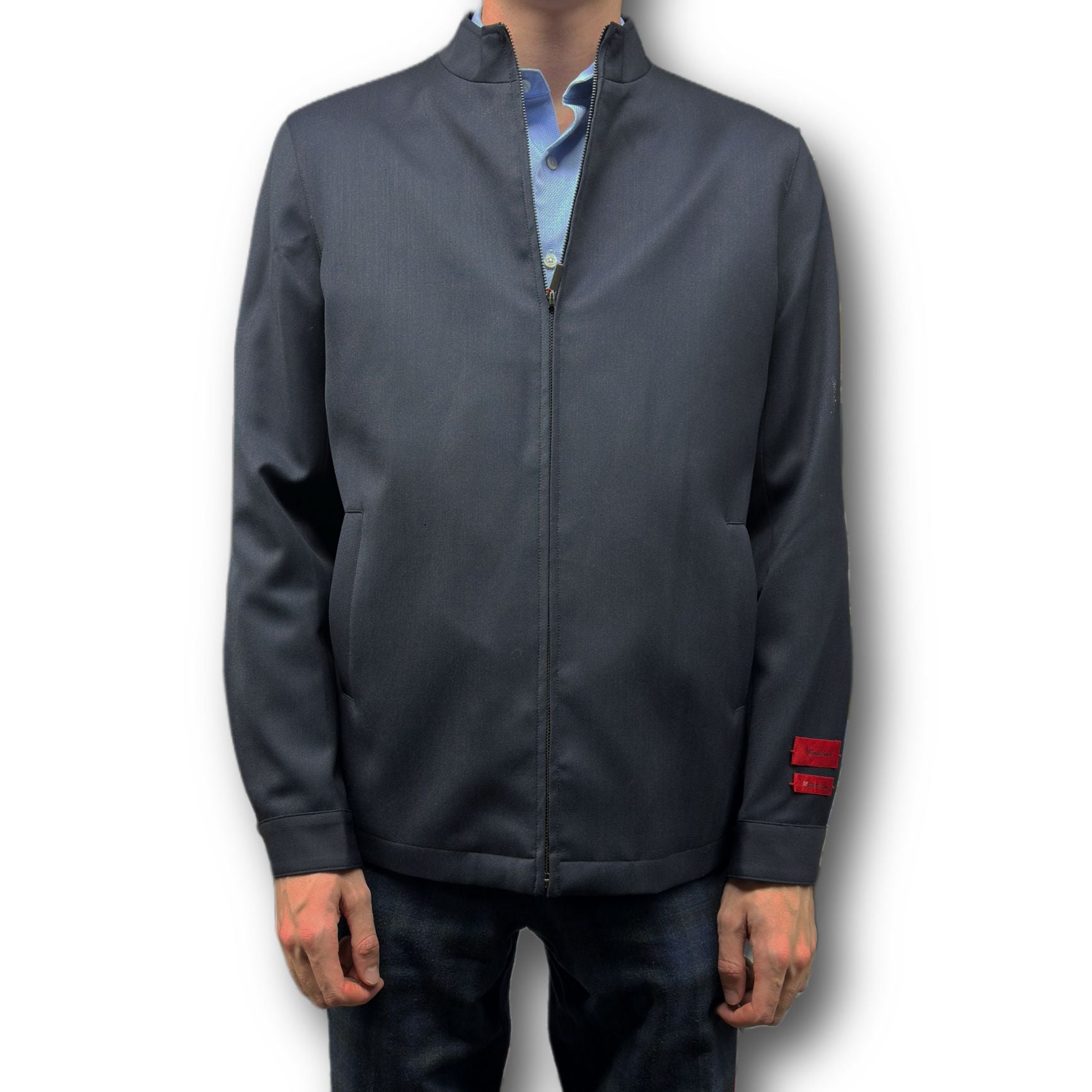 - Sleeve Details: Two red rectangular patches on the left sleeve, buttoned cuffs