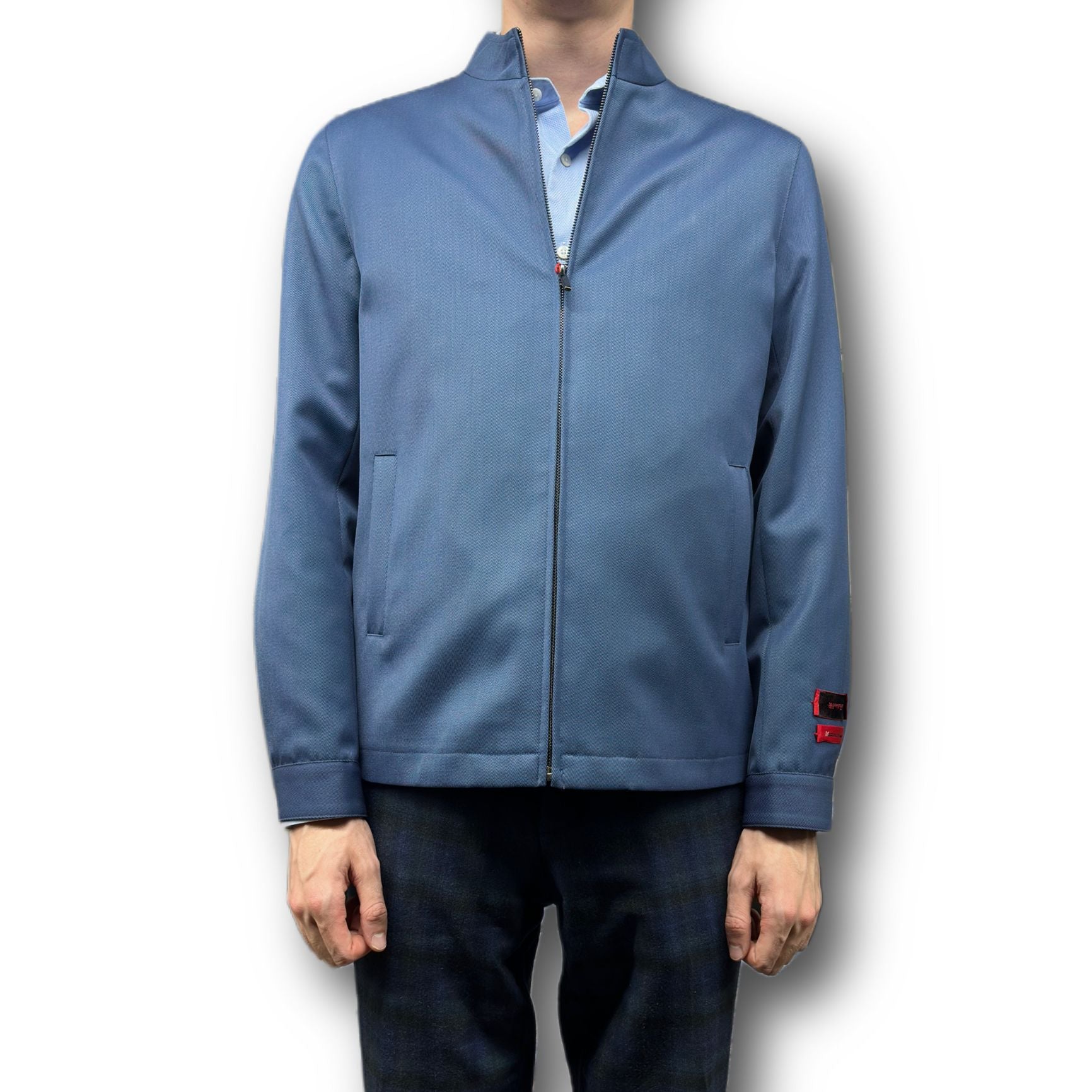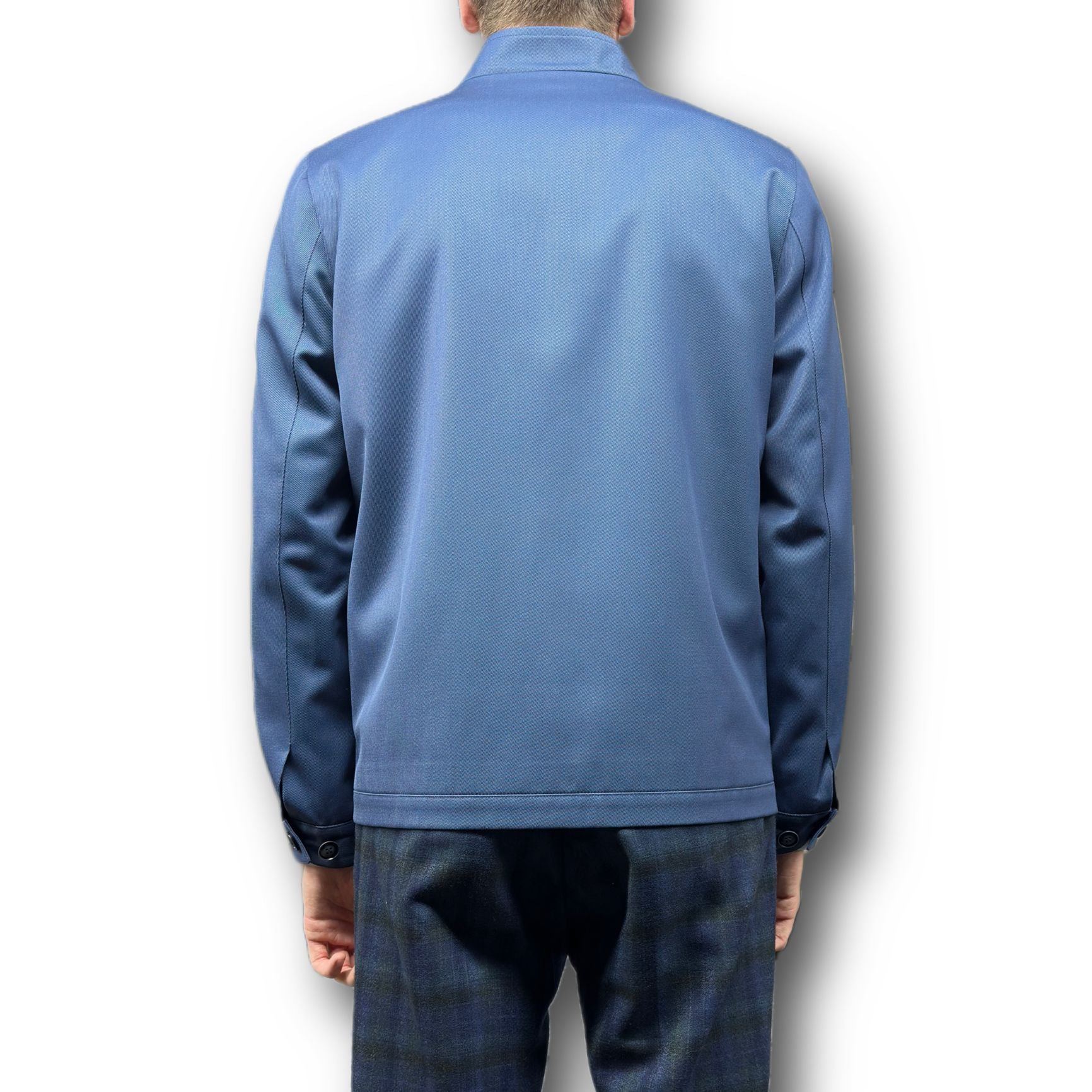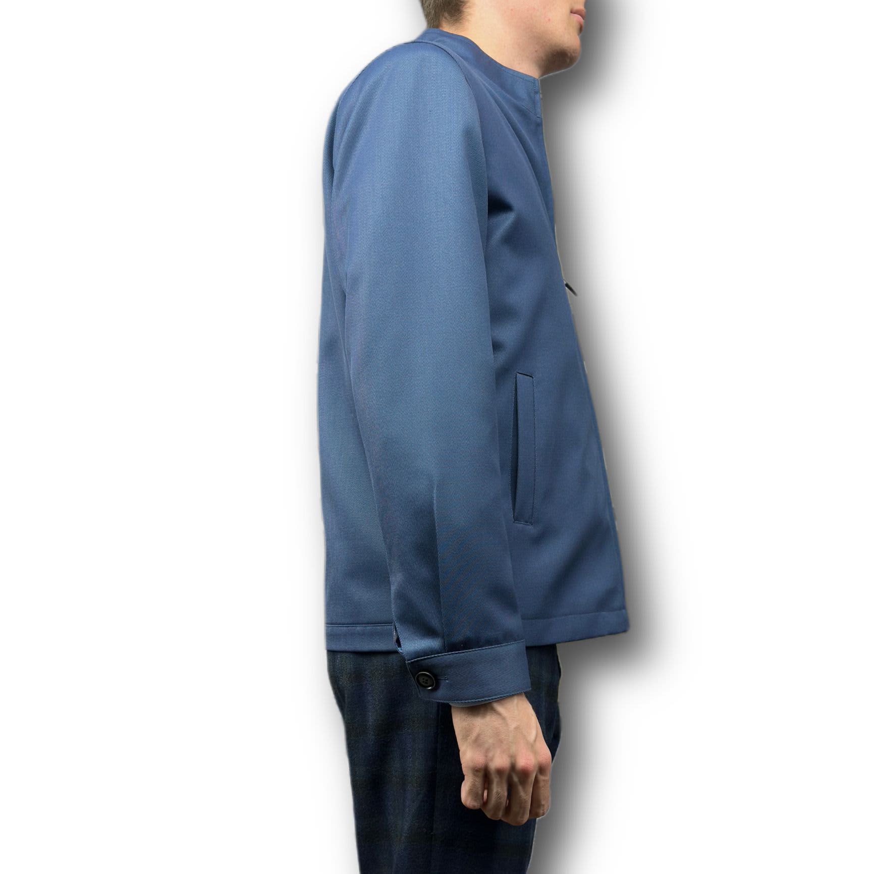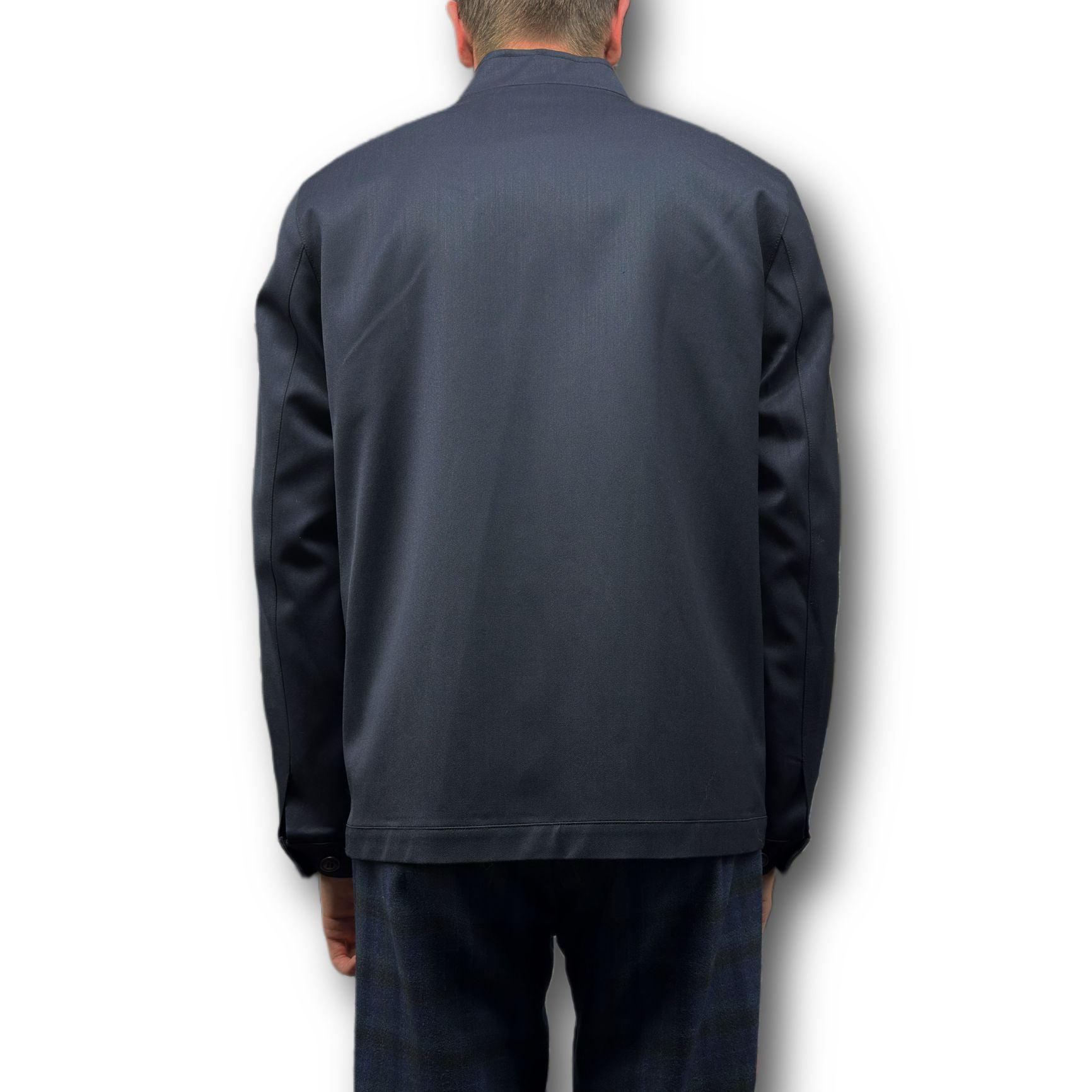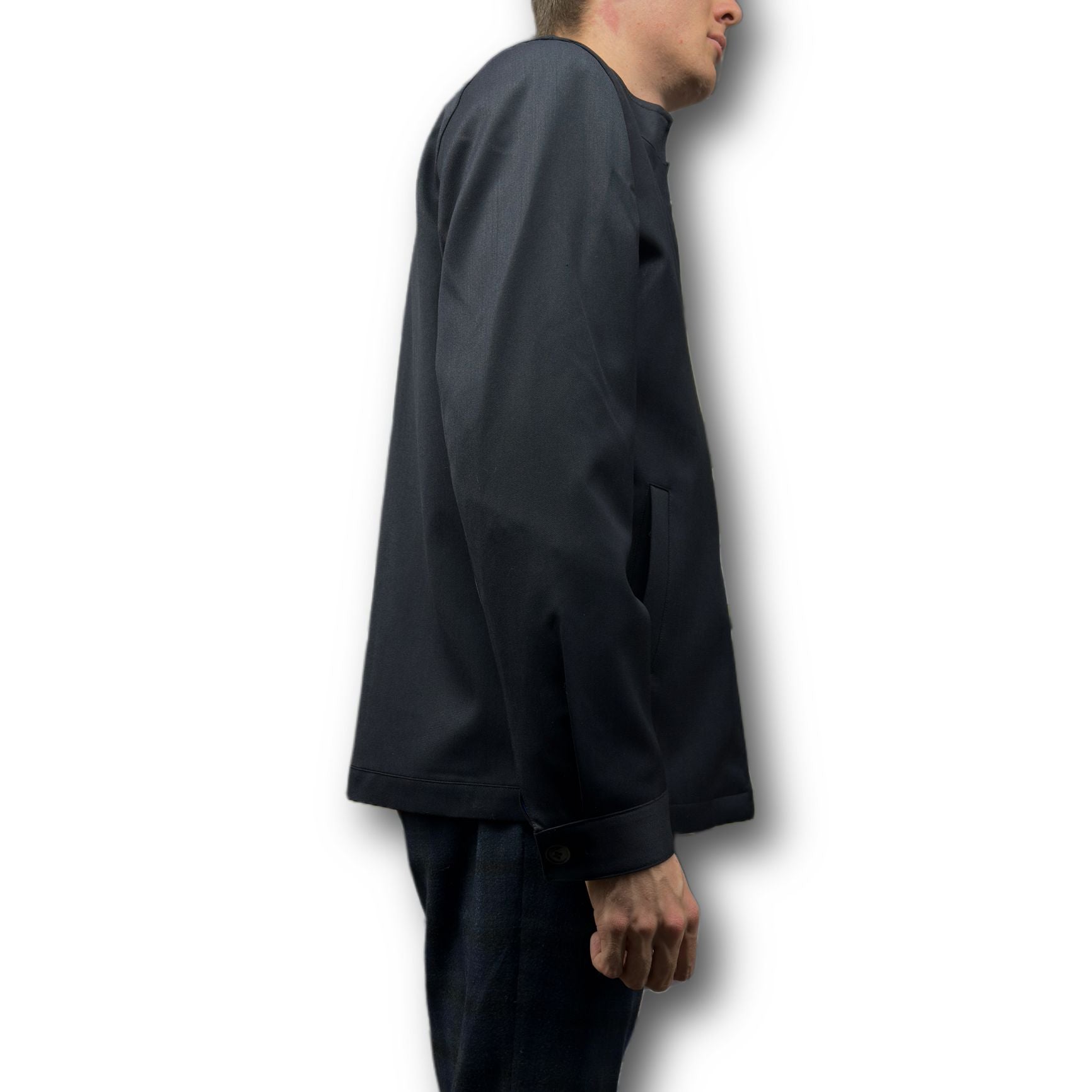 - Collar: Stand – up, structured with clean lines