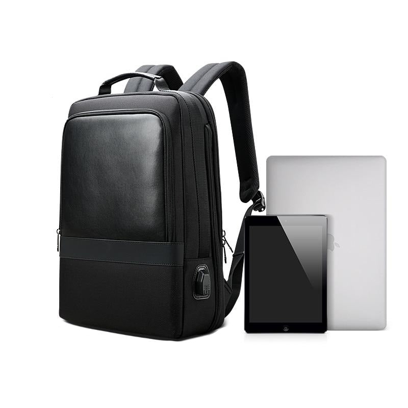 The backpack’s sleek and professional aesthetic is achieved through a combination of materials. The front panel is crafted from faux leather (PU leather) with a smooth, glossy finish, offering a premium look and scratch resistance. The main body is made of a sturdy, textured fabric, likely nylon or polyester, which provides both durability and water resistance. The thick, padded shoulder straps, possibly with mesh for breathability, and the padded back panel ensure maximum comfort during long use. The metal or high – quality plastic zippers with smooth pulls and adjustable buckles on the straps add to its durability and secure fit.