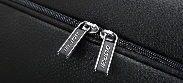 Featuring a sleek black exterior with blue interior lining, blue text/visual elements, and orange/blue zipper pulls in some variants, this backpack has a minimalist and professional aesthetic. The clean lines and multiple compartments enhance its overall appeal. Branding like “BOPAI” on zippers and straps gives it a consistent design language.