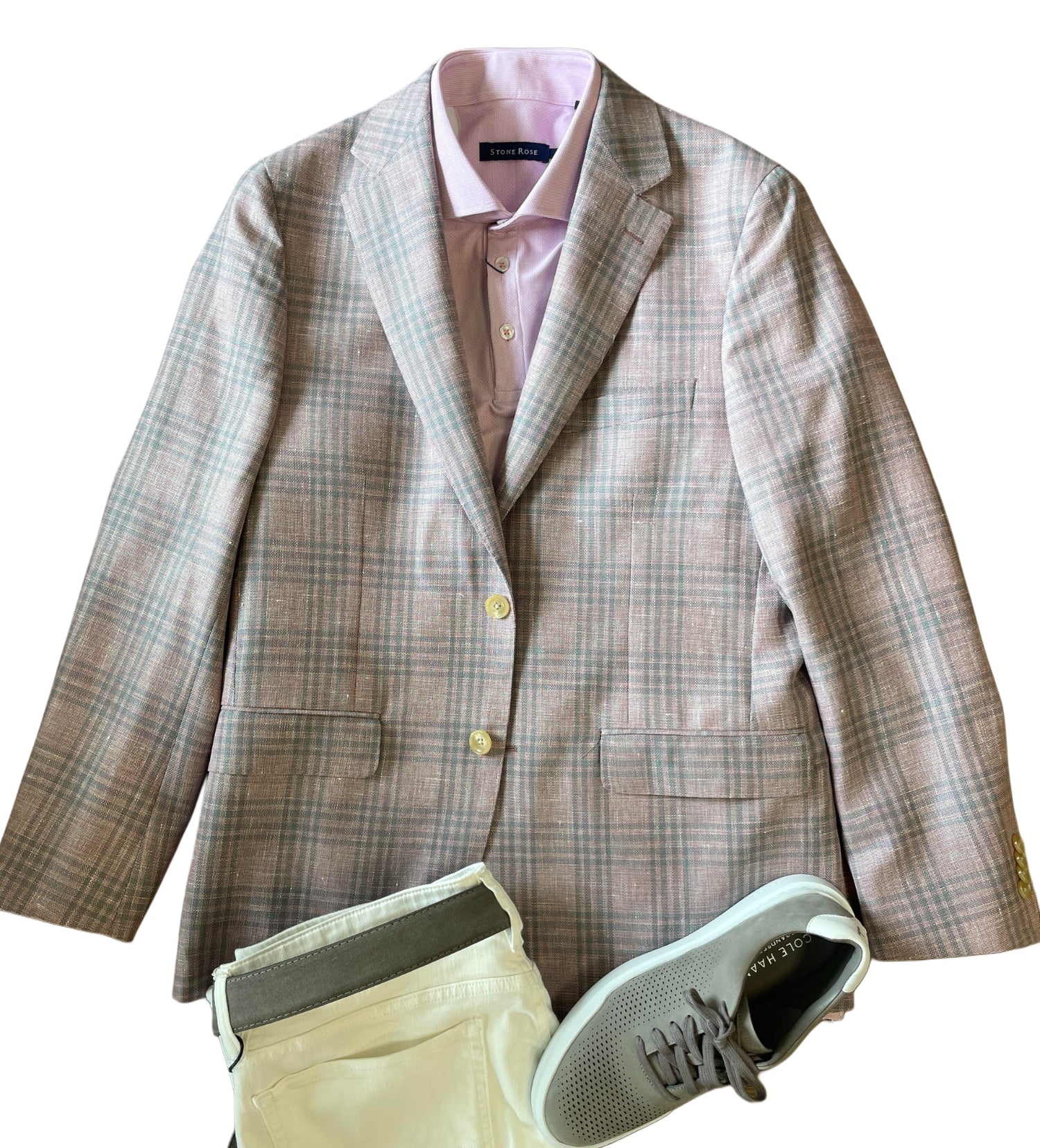 - Color: Pale pink/taupe with muted teal/greenish and gray/charcoal accents in a check pattern