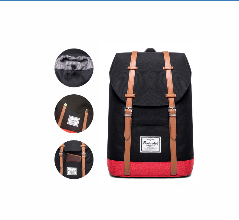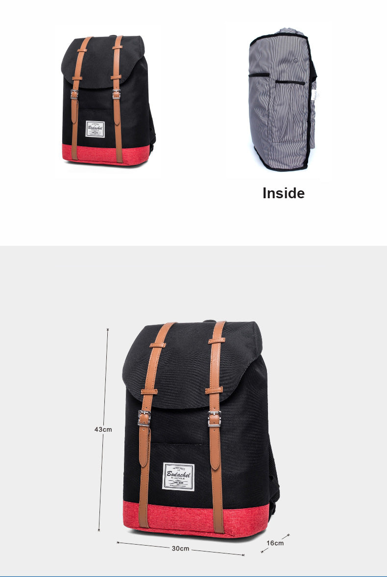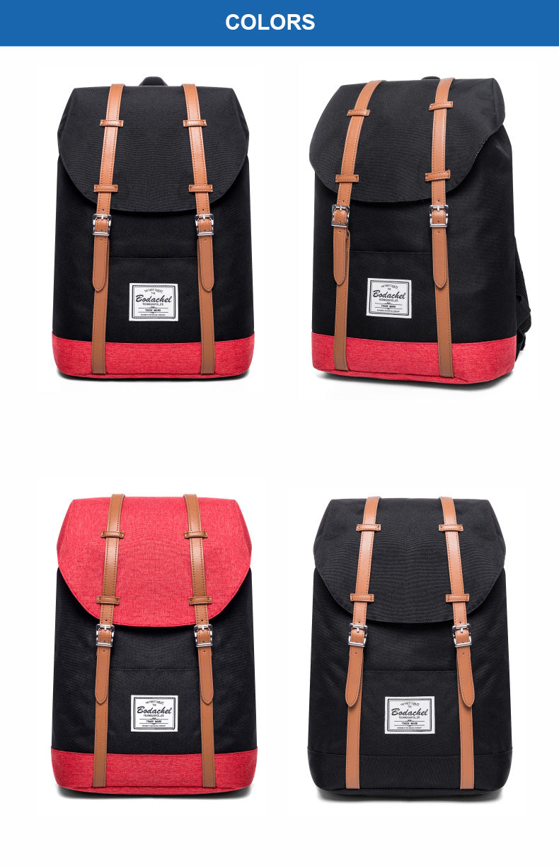 | Visual Elements | Flap closure with two brown straps and metal buckles (adjustable), white rectangular label with black text (“Bodachel”) on the front pocket, red bottom hem and red accents on the straps (back view), minimalist, vintage – inspired design with clean lines and contrast stitching |