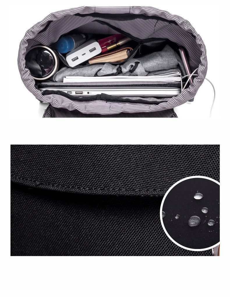 The backpack is crafted with a thick, textured outer fabric, likely a canvas or a canvas – like synthetic blend, which comes with a water – repellent finish. This finish ensures that water droplets bead on the surface, protecting your belongings during rainy days. The brown leather – like accents on the flap and straps, whether it’s faux or genuine leather, add a classic and stylish look. The inner lining is a striped, durable nylon/polyester blend fabric, making it easy to clean and offering great protection for your items.