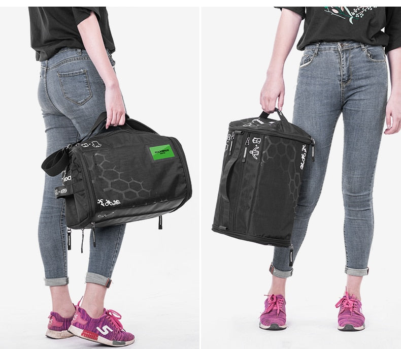 This bag comes with a host of useful features. It has multiple zippered sections labeled by icons to help you categorize your items easily. The transparent mesh side pocket for shoes allows for ventilation, easy access, and keeps dirty shoes separate. The adjustable shoulder strap is padded, removable, and reinforced with quick – release buckles for hands – free carrying. The top handle is reinforced and ergonomically padded for manual transport. The water – resistant fabric repels water, protecting your contents from light rain, and the reinforced zippers have pull tabs labeled “ROCKBROS” for easy grip and identification.
