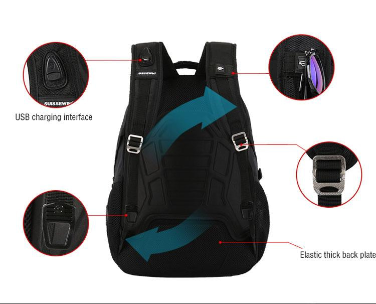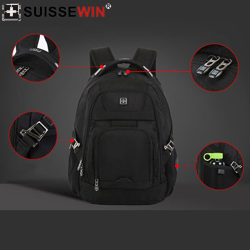 | Design Elements | “SUISSEWIN” text and cross emblem, silver/metallic zippers, buckles, pull tabs, multiple compartments, top carry handle, luggage pass-through |