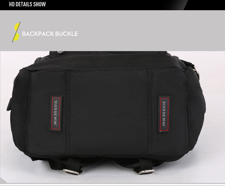 Constructed from a durable nylon or high-density synthetic fabric, this backpack offers excellent water resistance, tear strength, and light weight. The tight stitching, reinforced seams, and durable hardware, including metallic zippers with metal teeth and metal buckles/clasps, ensure long-term use. The smooth, wrinkle-free fabric and attention to detail, such as reinforced zipper pulls and padded straps, further demonstrate the high-quality manufacturing.
