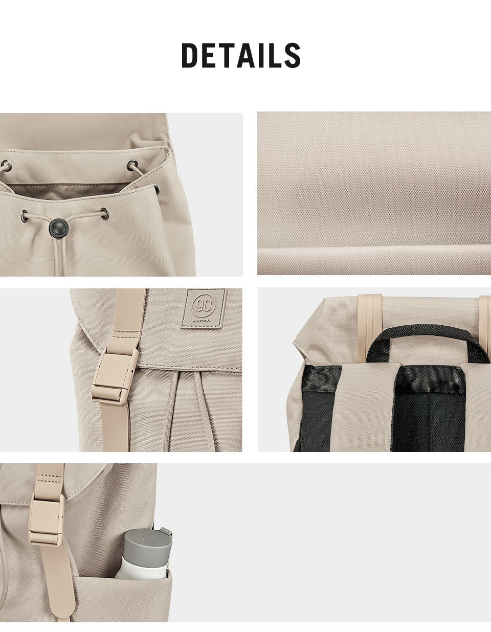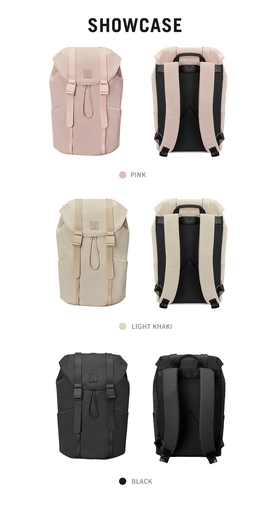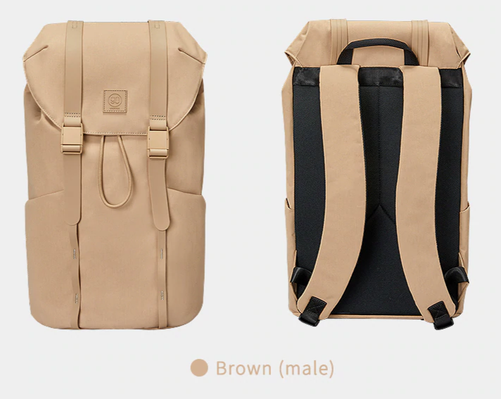 Available in a variety of colors including black, brown, grey, khaki, and pink, there’s a shade to suit every taste. The backpack features a clean, minimalist design with a flap closure secured by two buckles. It has front pockets, one with a drawstring and black toggle, a small loop for hanging accessories, and a structured flap with a brand logo patch. The sleek strap design includes padded sections for comfort.
