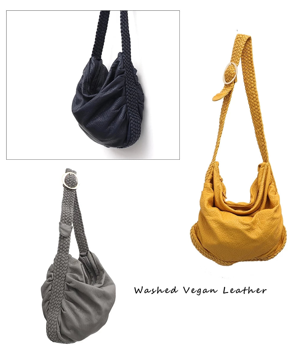 The main body of the bag is crafted from soft, pebbled vegan leather, labeled as “Washed Vegan Leather”. It has a wrinkled, textured finish that gives it a casual, lived – in look. The braided strap, on the other hand, is made from a woven material (likely synthetic leather or durable fabric) with an intricate, braided pattern, adding both texture and structure.