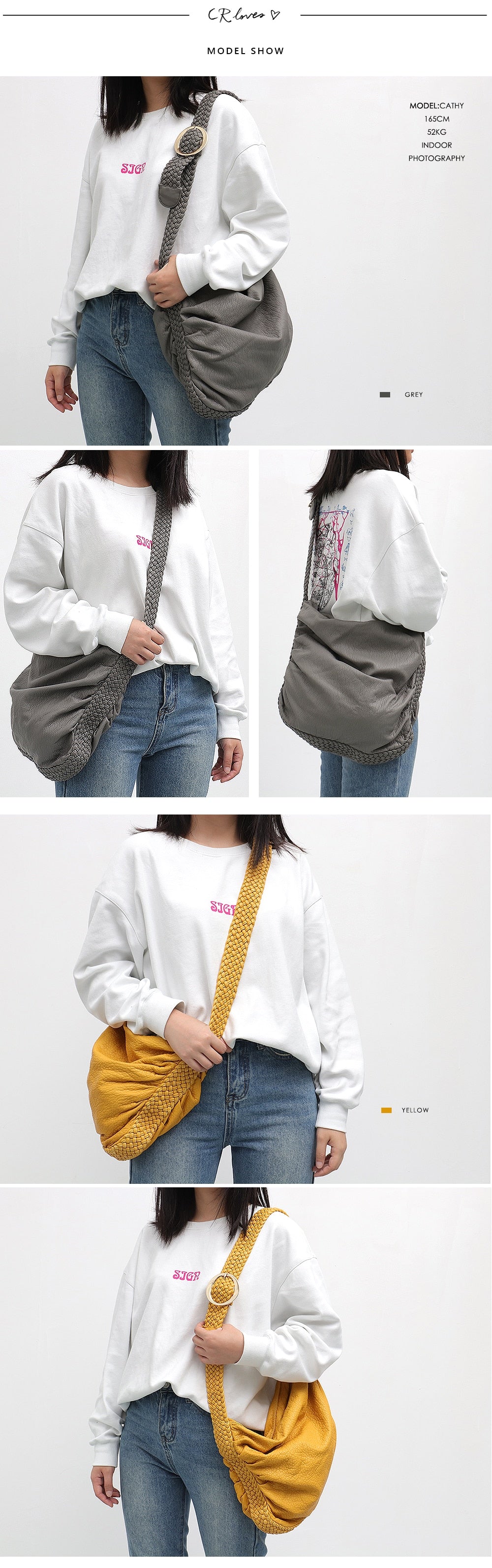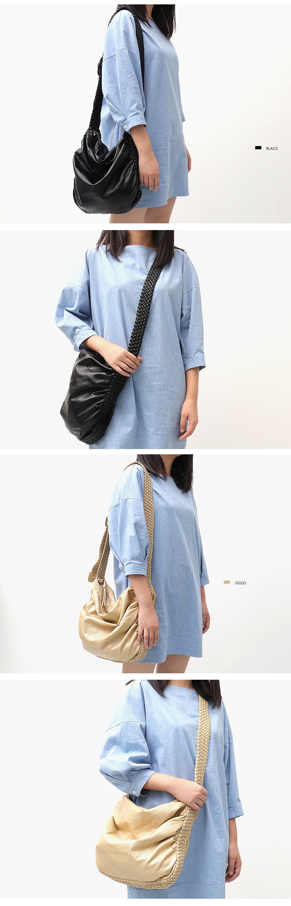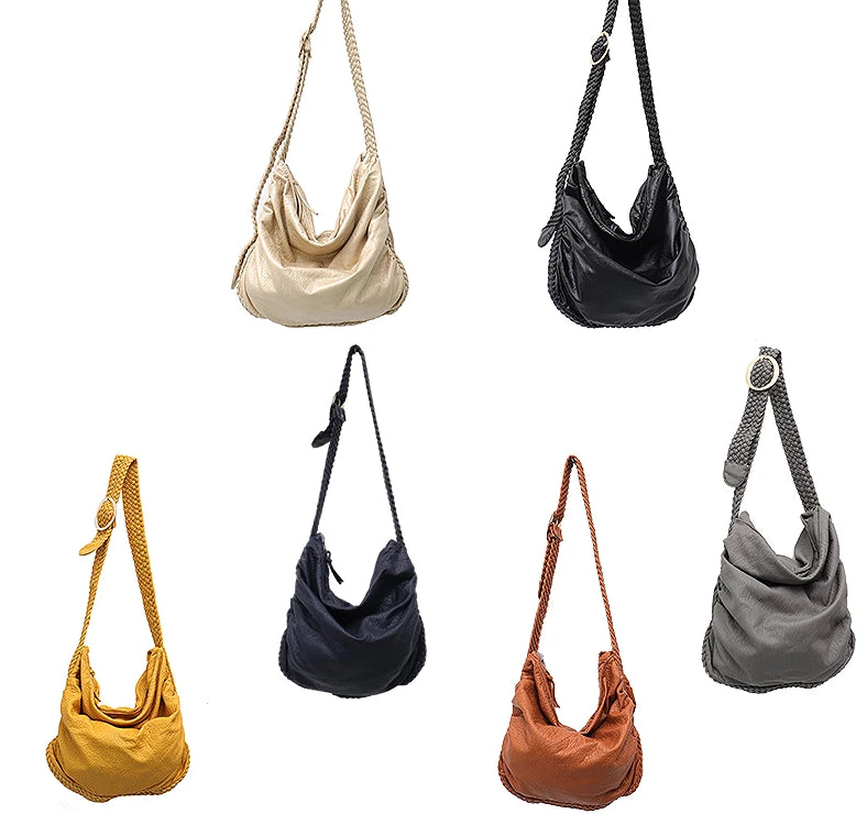 Available in a range of colors including Classic Black, Daffodil Yellow, Gold, Navy, Stone Grey, and Tan, you can choose the one that best suits your personal style. The bag features a soft, slouchy, and gathered (hobo – style) silhouette with a wide, open top for easy access. The braided strap has a gold or silver metal ring for length adjustment or decoration, and the top is closed with a zipper to ensure the security of your belongings.