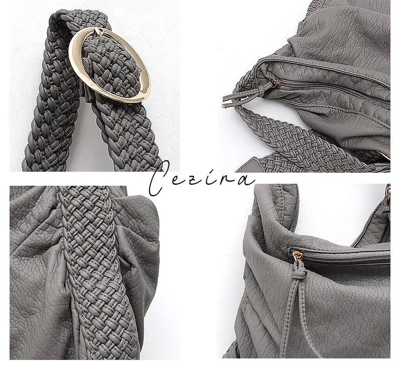 | Design Elements | Soft, slouchy, and gathered silhouette; braided/woven strap with metal ring; zippered top |