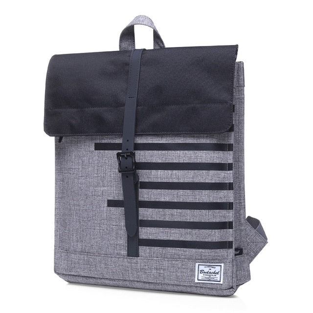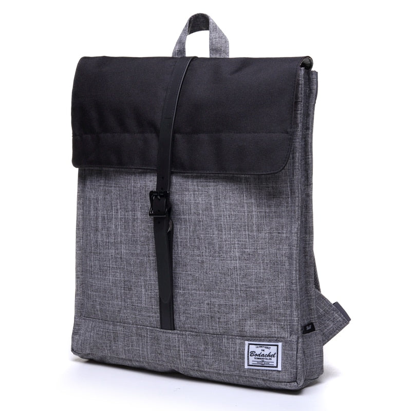 The backpack features a flap closure with a buckle, offering a secure way to hold the main compartment. This design choice gives the backpack a sleek look without the bulk of zippers. The buckle strap is made of a leather-like or synthetic material, adding a polished finish. There is also a small brand label, “Bodache” or similar, on the front.