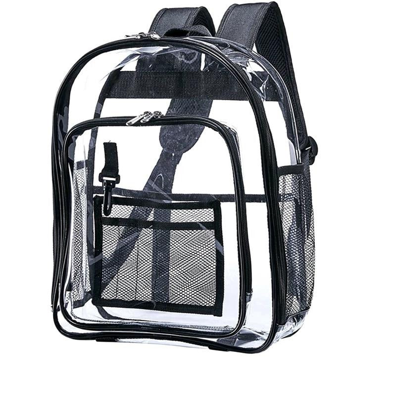 The primary material of this backpack is clear, rigid PVC/plastic, which is transparent, durable, waterproof, and easy to clean. The black accents, crafted from nylon/polyester fabric, adorn the straps, zippers, and trim, adding a touch of elegance. The metal/plastic zippers with a shiny finish ensure smooth operation, while the nylon mesh pockets provide breathability and lightweight storage for items like water bottles and small tools. A reinforced plastic frame maintains the backpack’s shape and prevents sagging.