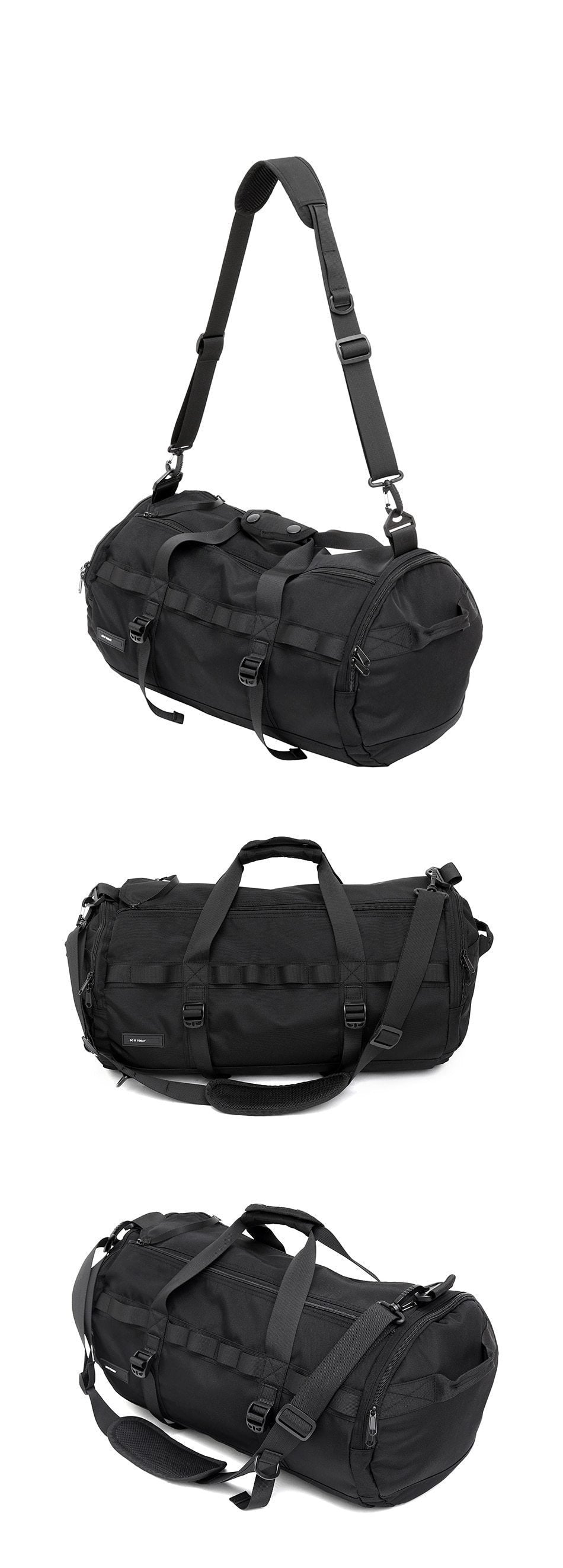| Design Elements | Cylindrical shape, modular straps, zippered compartments, tactical accents |