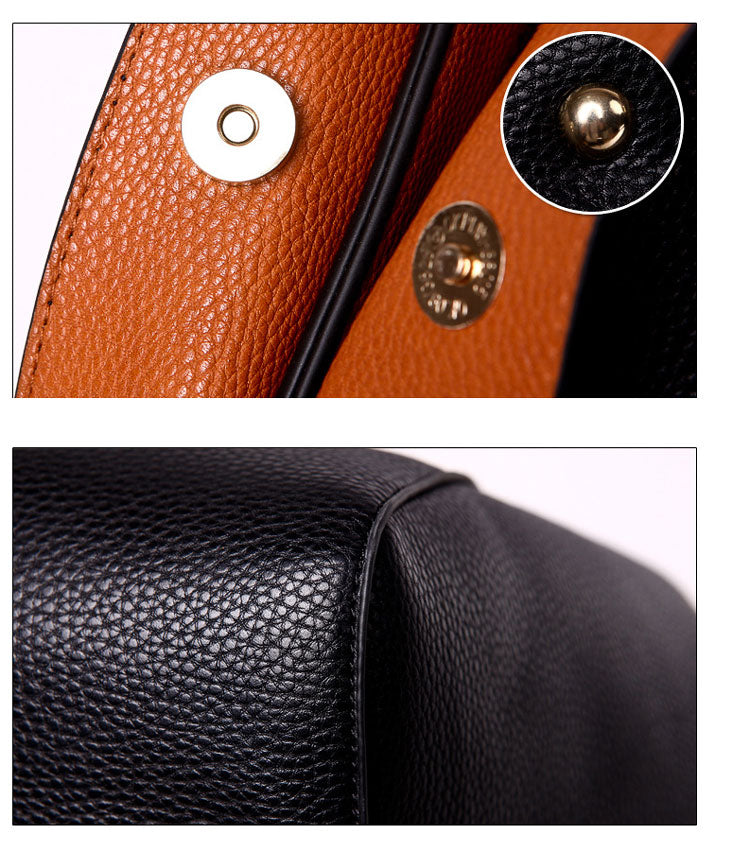The exterior of the bag is crafted from either pebbled faux leather or genuine leather, featuring a consistent texture with a visible grain pattern. This not only gives it a premium aesthetic but also ensures durability, with water and scratch resistance suitable for daily wear. The interior lining is a warm orange – brown (cognac) color, likely made of a smooth fabric like polyester or nylon, which is easy to clean and creates a beautiful contrast with the exterior.