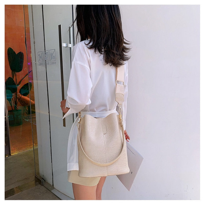 It is available in a range of beautiful colors including Army Green, Classic Black, Cream, and Mocha. The prominent crocodile – skin embossed texture on the exterior gives it a classic and luxurious look. The bucket shape, with a wide, rounded top that tapers slightly downward, creates a structured yet soft silhouette.