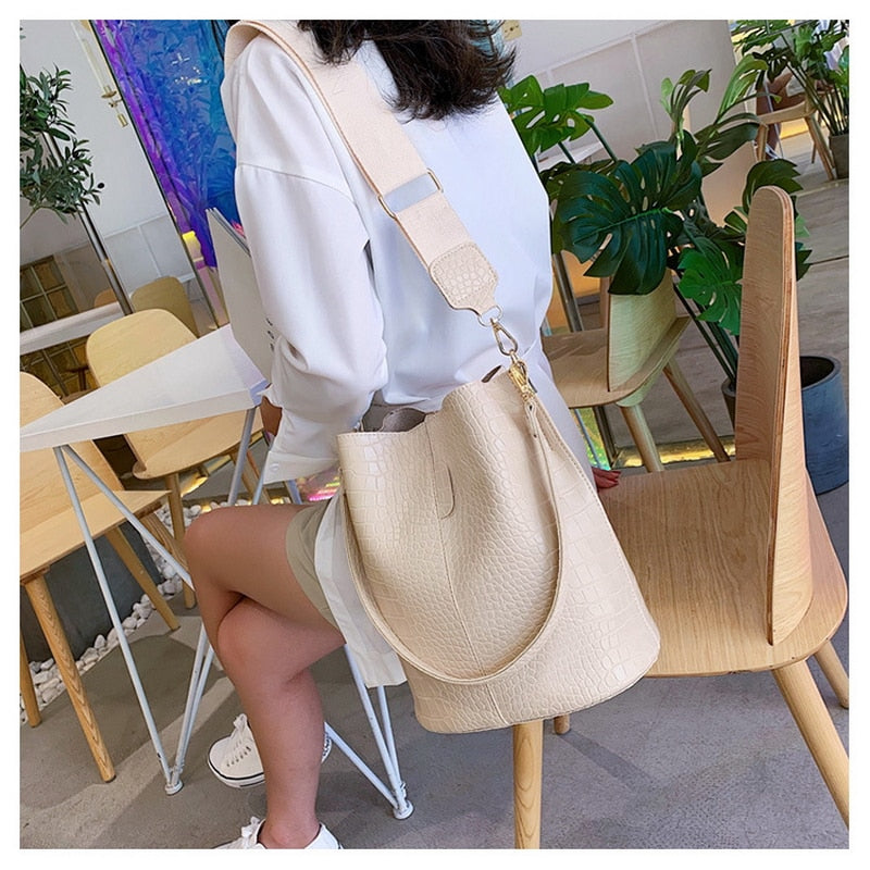 Introducing the Women’s Crocodile Vegan Bucket Leather Tote, a stylish and functional accessory designed for the modern woman. This women’s fashion bucket bag is perfect for everyday use, offering a blend of luxury and practicality.