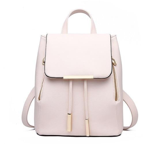 The exterior of the backpack is made of smooth, faux leather (PU) with a cross – grain texture. This material is not only durable and scratch – resistant but also gives it an elegant look. The metallic accents, including gold or silver – toned bars and zipper pulls, along with metal zippers, add a polished finish. The straps are made of the same faux leather as the body, ensuring consistency and comfort.