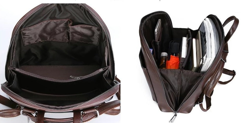 The exterior of the backpack is crafted from smooth faux leather (PU leather) with a polished, slightly shiny finish, mimicking the texture and durability of genuine leather. The interior features a dark, durable fabric, likely nylon or polyester, which is easy to clean and helps with organization.