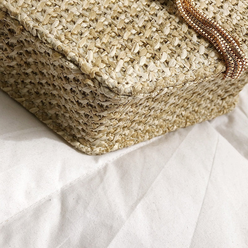 The bag’s main body is crafted from woven natural fiber, likely straw or synthetic straw, presenting a coarse, textured appearance. The top flap is made of smooth faux leather with stitched edges, offering a beautiful textural contrast. The gold – toned metal chain strap, with its shiny chain – link design, is detachable and adjustable, allowing for both crossbody and shoulder wear.