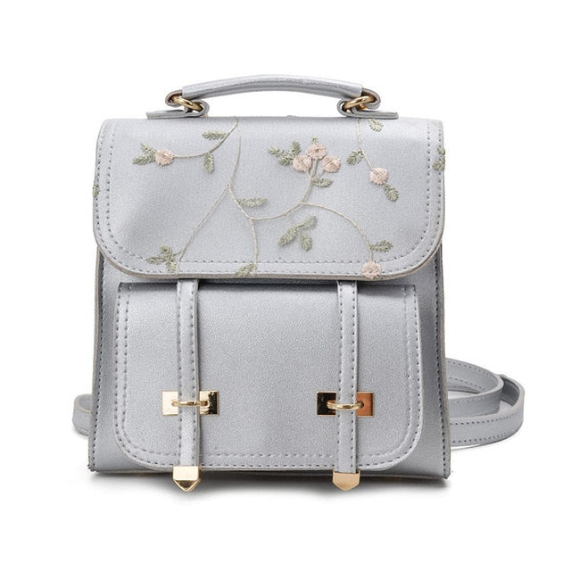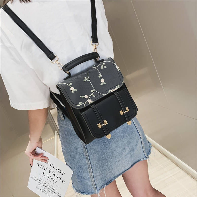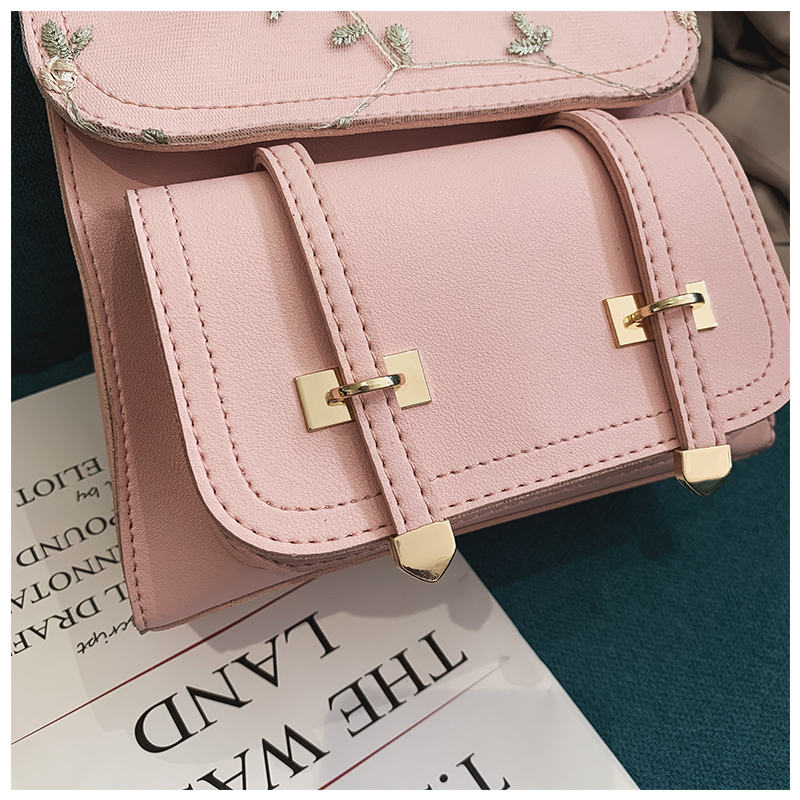 Crafted from durable faux leather (PU leather) with a smooth, slightly glossy finish, it offers the look and feel of real leather without the high cost. The gold – toned metal accents, including buckles, clasps, and rings, not only provide structural support but also add a polished aesthetic touch. Delicate floral embroidery using fine thread adorns the flap, with branches, small flowers, and leaves stitched in complementary colors, enhancing its overall charm.