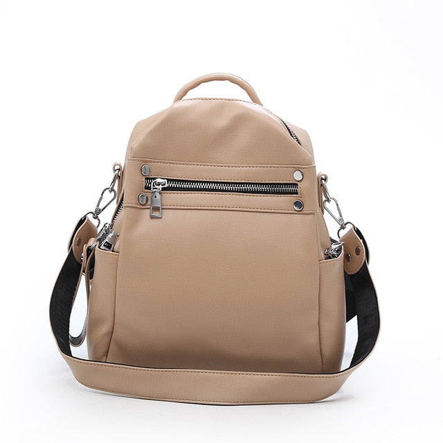 Available in a range of stylish colors including black, khaki, pink, and white, this backpack offers neutral tones for versatility. The minimalist and modern design features clean lines, a prominent front zipper pocket with a small flap/closure, side zippered pockets for quick access to items like keys or umbrellas, adjustable shoulder straps, and a top handle for hand – carrying. The metallic silver zippers and hardware provide a striking contrast.