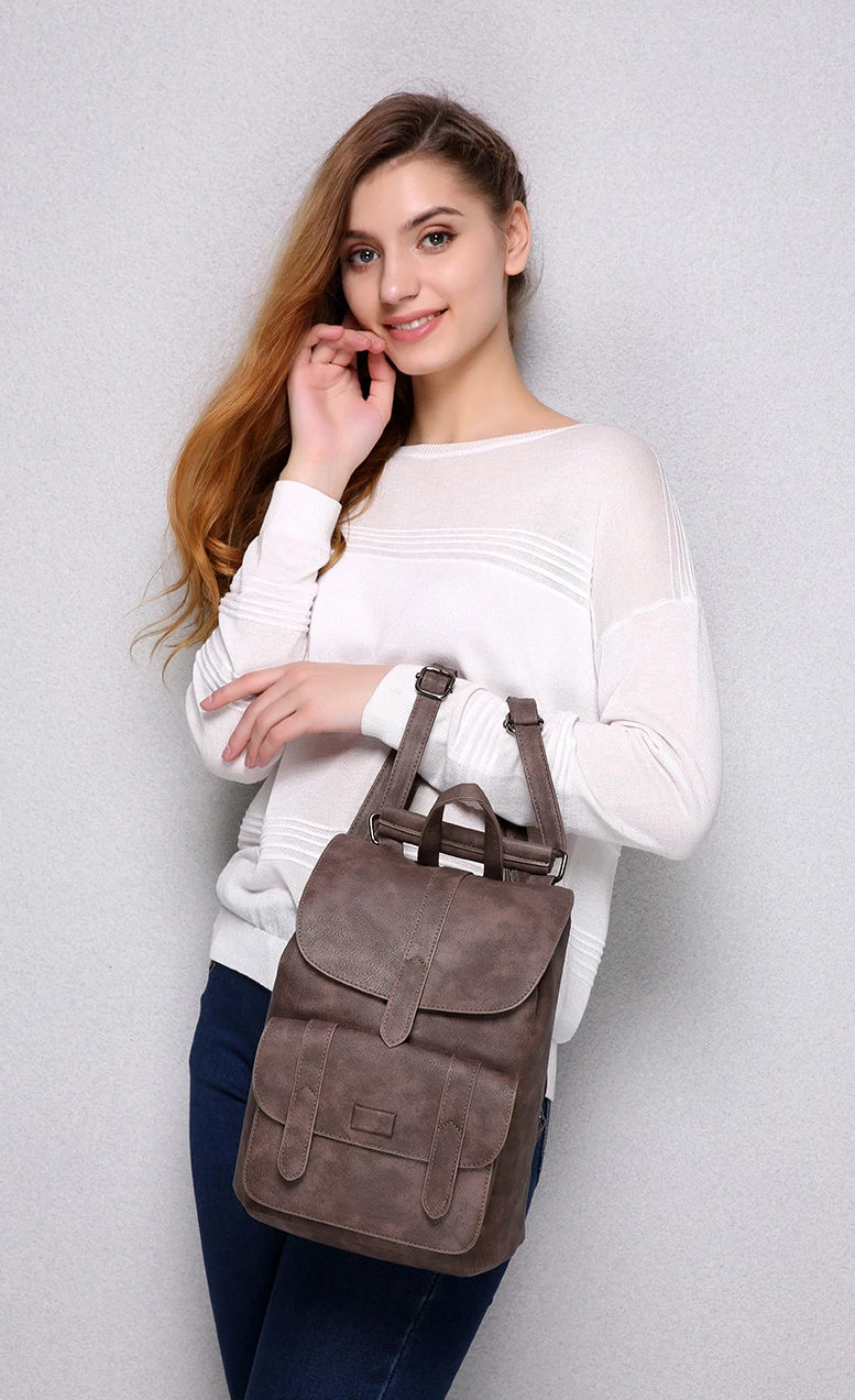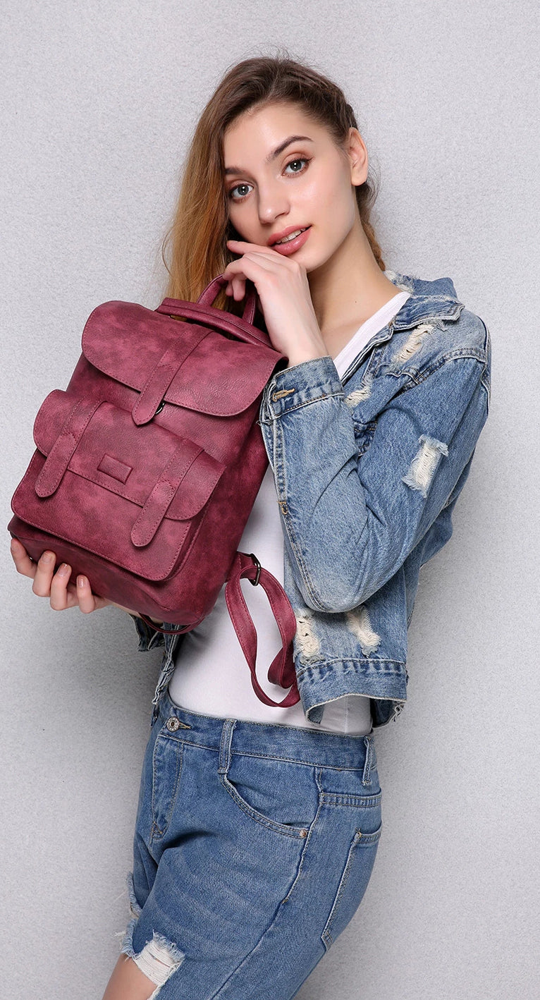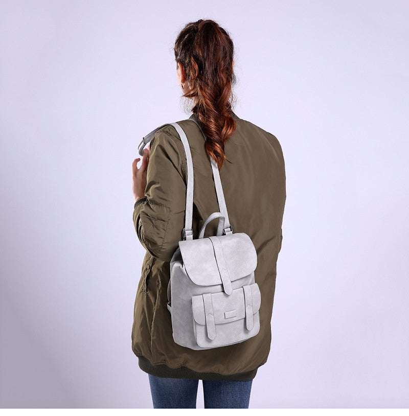 | Design | Classic, minimalist with top flap closure, front pocket with dual vertical straps and small rectangular detail, carry handle on top, adjustable shoulder straps |
