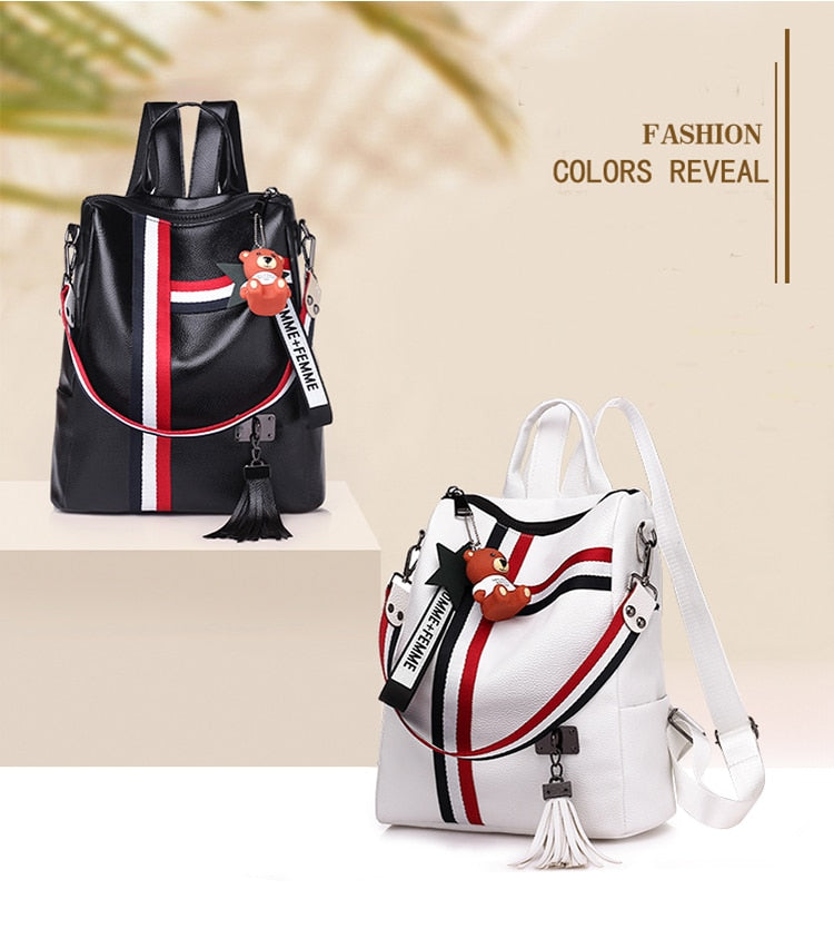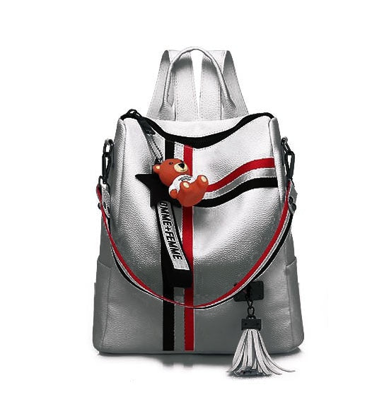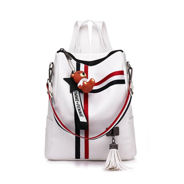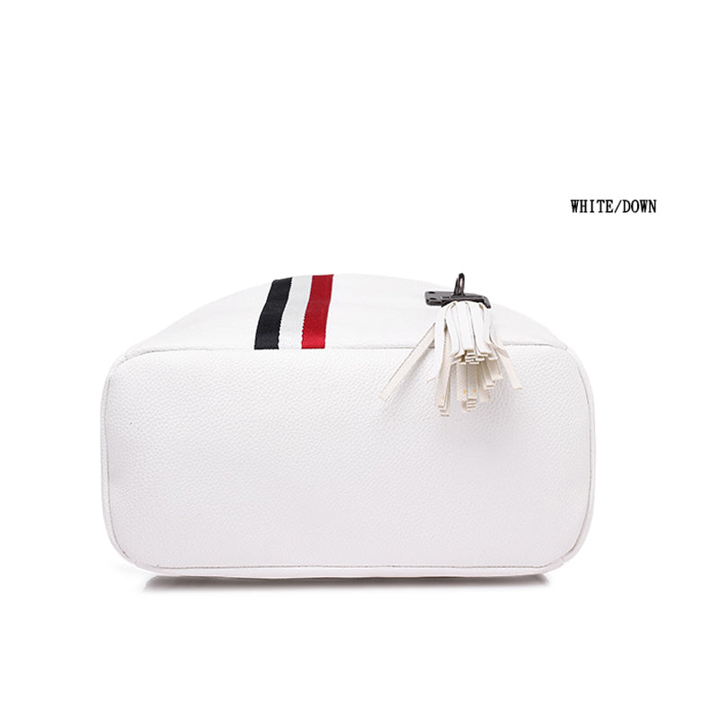 Available in a range of colors – Black, Burnt Gold, Silver, and White, the backpack also features red, white, black, and navy (or dark blue) striped patterns on the front panel and straps, creating a sporty and stylish contrast. The decorative elements add a unique and playful touch, such as the brown teddy bear charm with a “HOMME+FEMME” tag and a black star charm attached to it, along with a tassel that matches the base color.