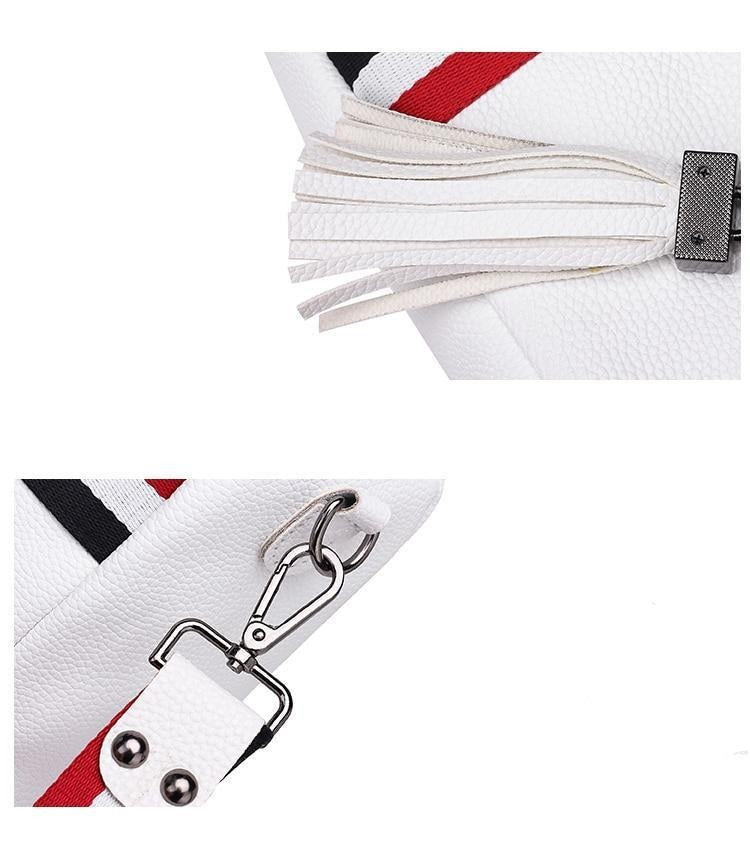 The primary body of the backpack is crafted from faux leather (PU leather) with a textured, pebbled finish that is smooth and durable. The tassels are made of fabric or leather fringes, matching the base color of the backpack. The hardware, including metal zippers, buckles, and clasps in a silver – toned finish, is sturdy and functional. The adjustable fabric/leather straps with metal buckles ensure a comfortable and customized fit.