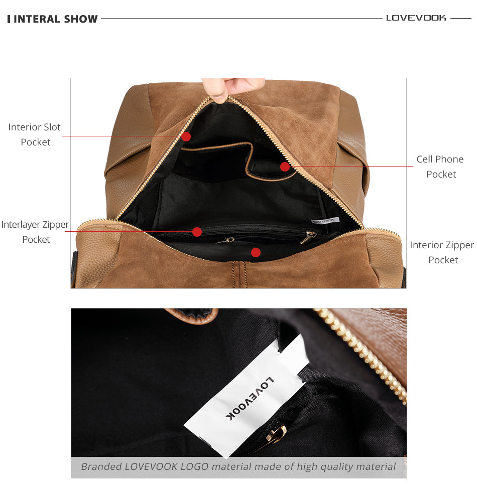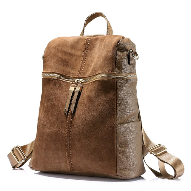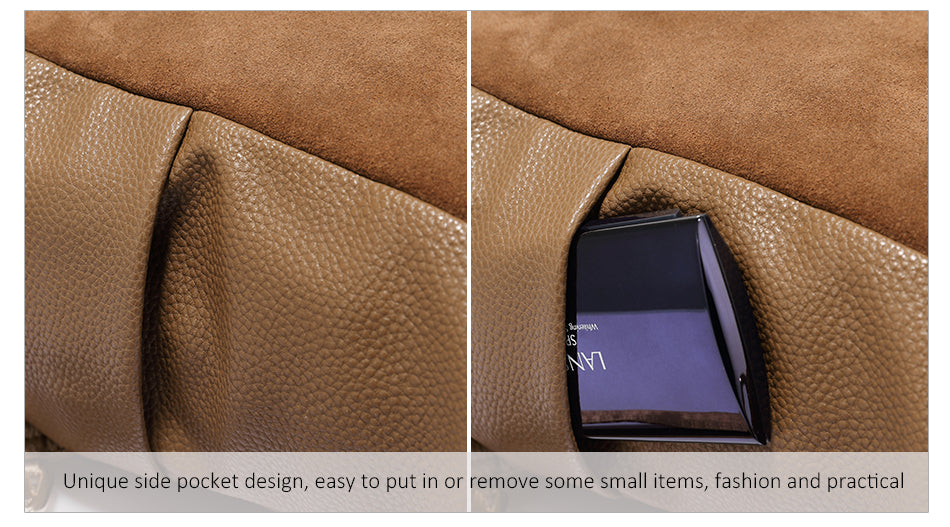 It features a unique two – tone construction, combining a suede – like fabric on the upper/front sections with a soft texture and pebbled genuine leather on the lower/side sections for durability. The gold – toned metal hardware, including zippers, buckles, and zipper pulls, not only adds a touch of elegance but also ensures anti – oxidation and long – lasting use. The interior is lined with a smooth, dark – toned fabric, likely polyester/nylon, for easy cleaning and organization.